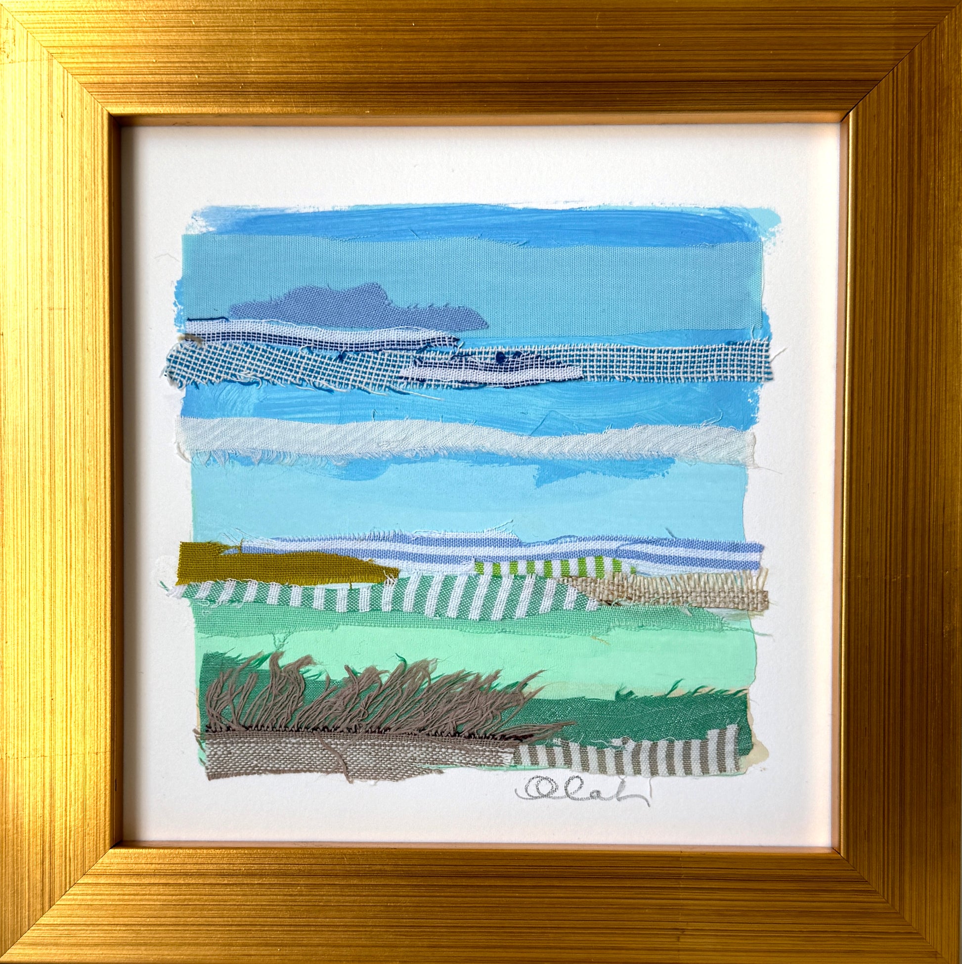 mint, blue and green, blue and white, shore, shoreline, spartina, marsh, Seersucker, gingham, cotton, blue stripes, blue, shades of blue, ocean, blue and neutral, pastel, dreamscape, seascape, beach, landscape, Charleston, coastal, sail, sailboat, harbor, abstract, abstracted landscape, coastal modern, collage, fabric, textiles, quilt