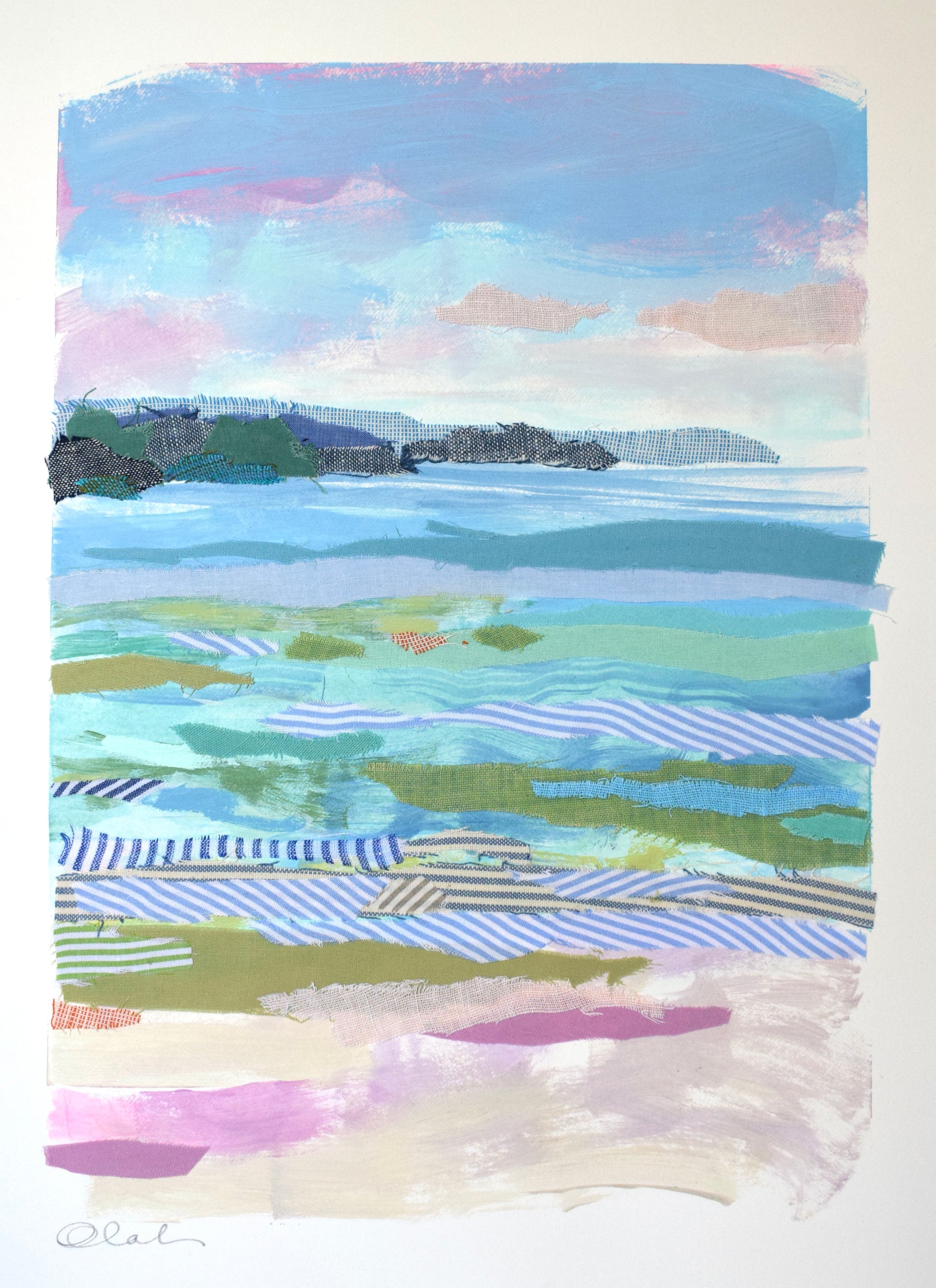 Seersucker, cotton, blue, shades of pink, shades of blue, blue stripes, dreamscape, seascape, coastal, abstract, abstracted landscape, coastal modern, fabric, textiles, texture, threads, fringe, fiber art, seascape, marsh, coral, river, Charleston, marsh, harbor, bay, lowcountry, South Carolina, turquoise, chartreuse