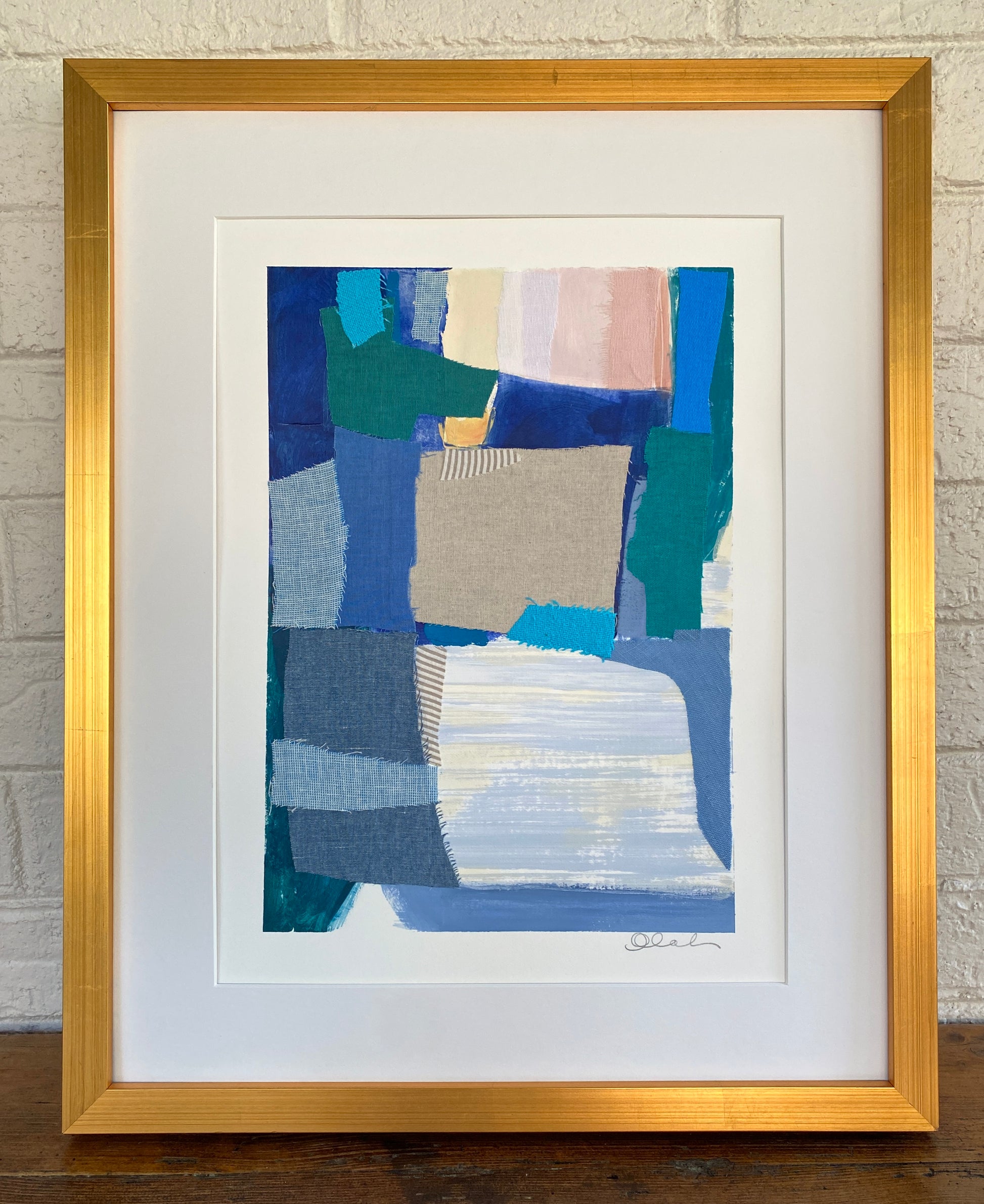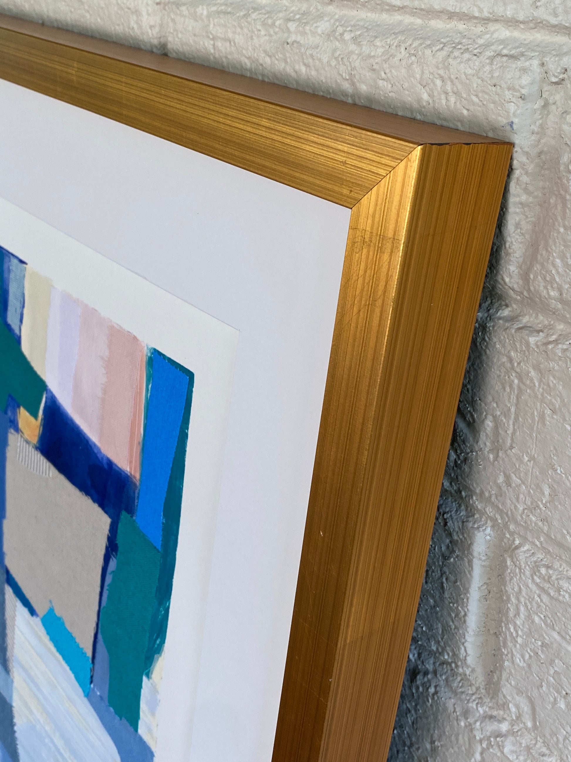 Acrylic + Textiles on Fabriano Paper, White Archival Mat, Acrylic Glass Cover, Gold-leaf wood frame, wired and ready to hang