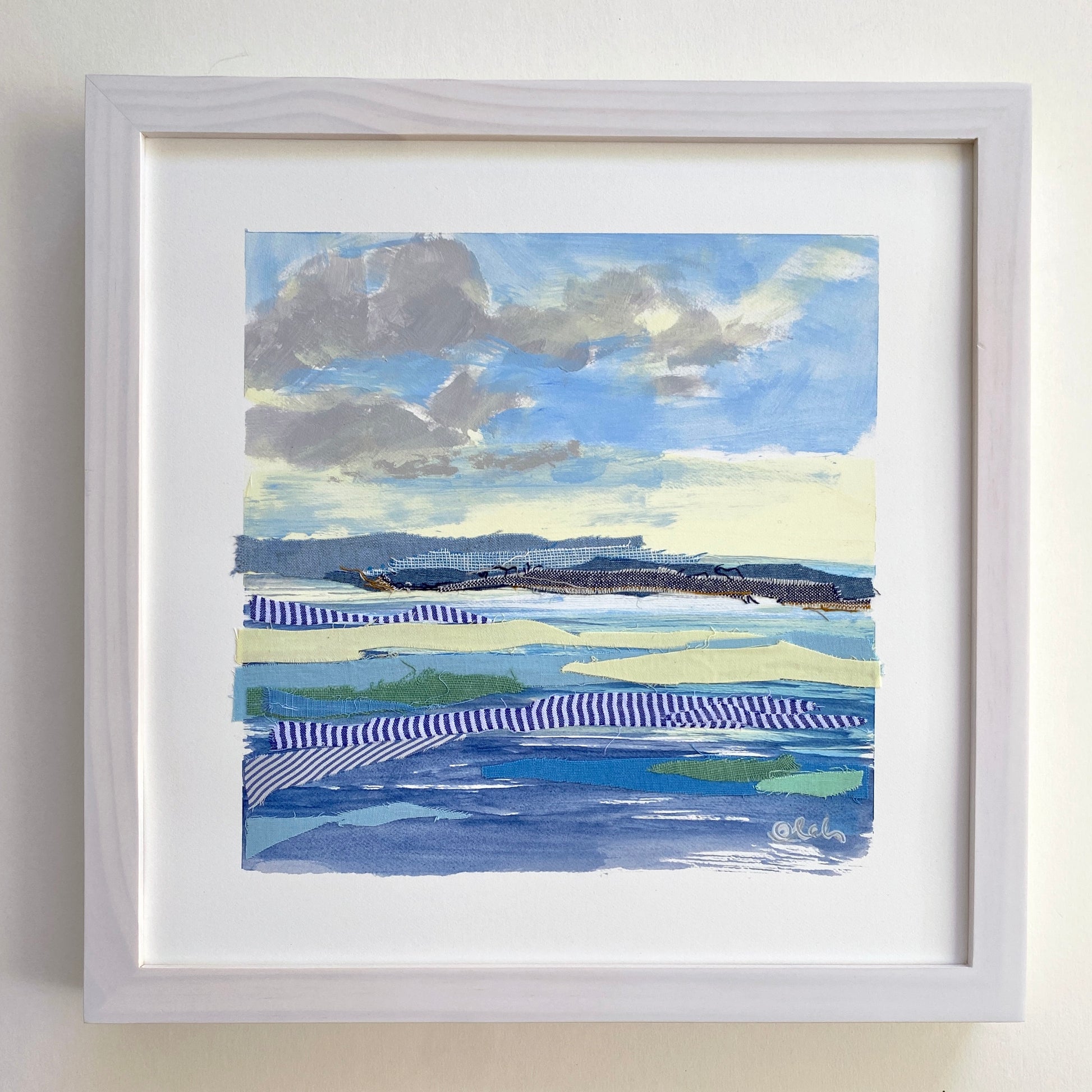 Seersucker, cotton, blue, shades of blue and green, blue stripes, dreamscape, seascape, coastal, waves, ocean, blue and white, clouds, abstract, abstracted landscape, coastal modern, fabric, textiles
