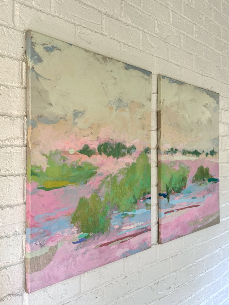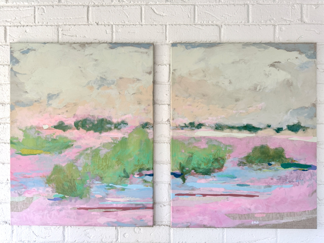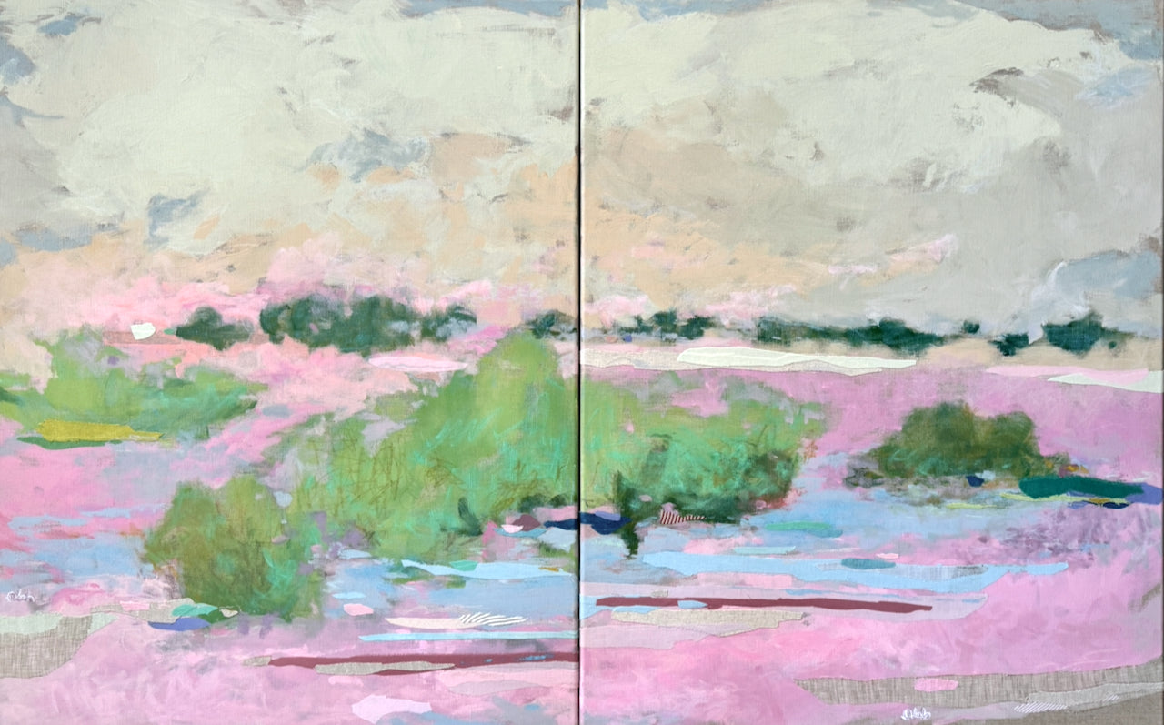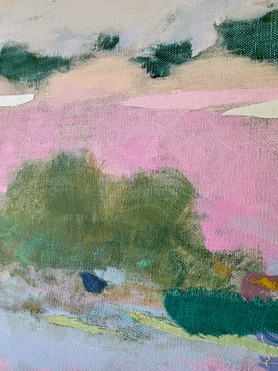 Charleston, Lowcountry, South Carolina, clouds, rose, pink, mauve, blush, marsh, pink and green, Seersucker, cotton, pink stripes, blue, shades of pink, rose and neutral, pastel, dreamscape, seascape, beach, coastal, harbor, abstract, abstracted landscape, coastal modern, collage, fabric, textiles, quilt, cotton anniversary, linen anniversary