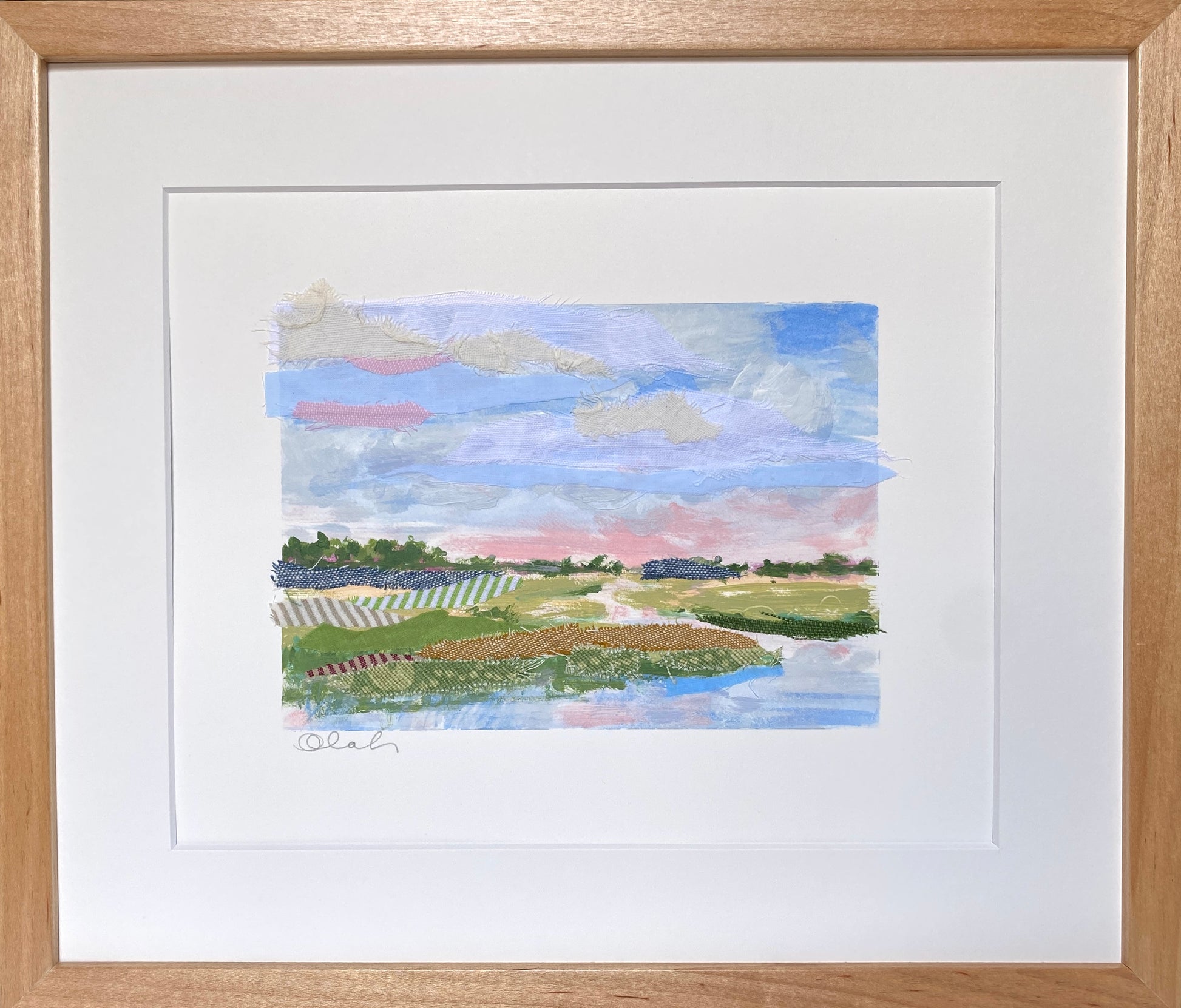 Seersucker, cotton, blue, shades of blue, blue stripes, pink, marsh, chartreuse, clouds, cloudscape, lowcountry, charleston, dreamscape, seascape, coastal, abstract, abstracted landscape, coastal modern, fabric, textiles