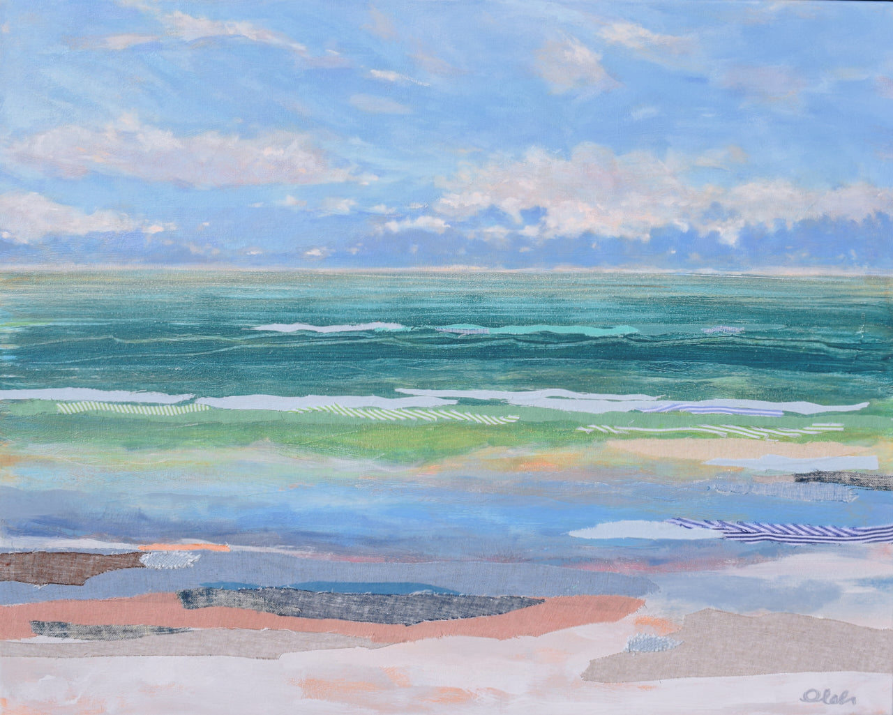 abstract coastal, ocean, East Coast, lowcountry, multicolor, blue green, clouds, sea, Seersucker, cotton, linen, blue, stripes, dreamscape, seascape, beach, landscape, Charleston, South Carolina, coastal modern, collage, fabric, textiles, quilt, fiber art