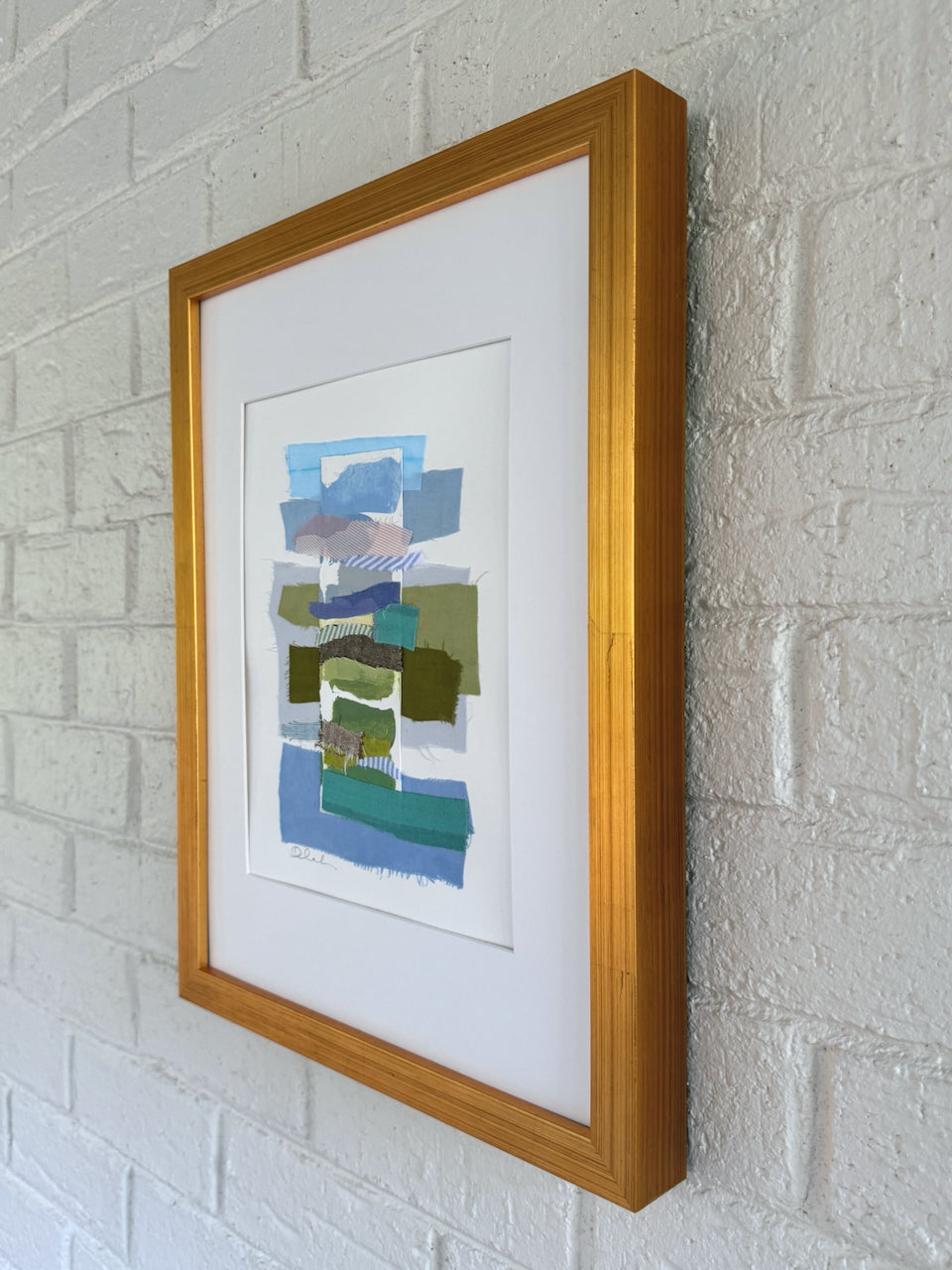 Acrylic + Textiles on Fabriano Paper, White Archival Mat, Acrylic Glass Cover, Gold-Leaf Wood Frame, Wired and Ready to hang