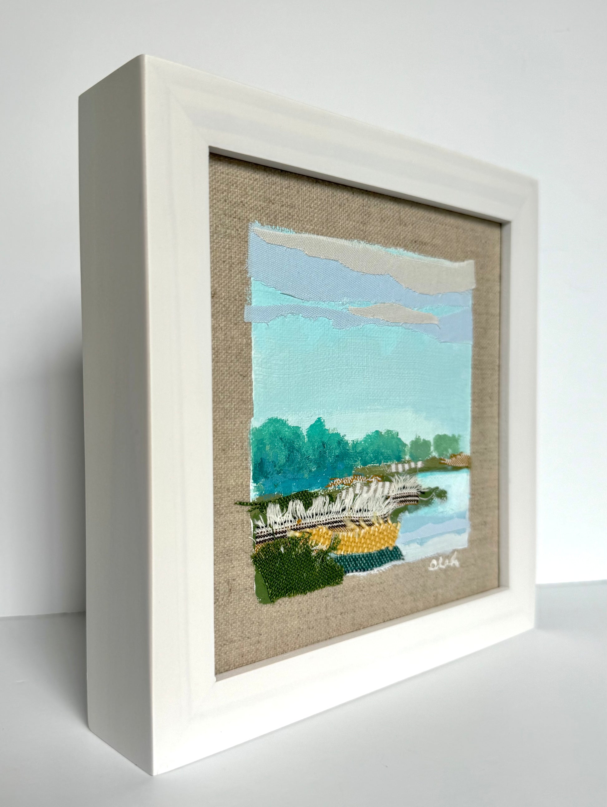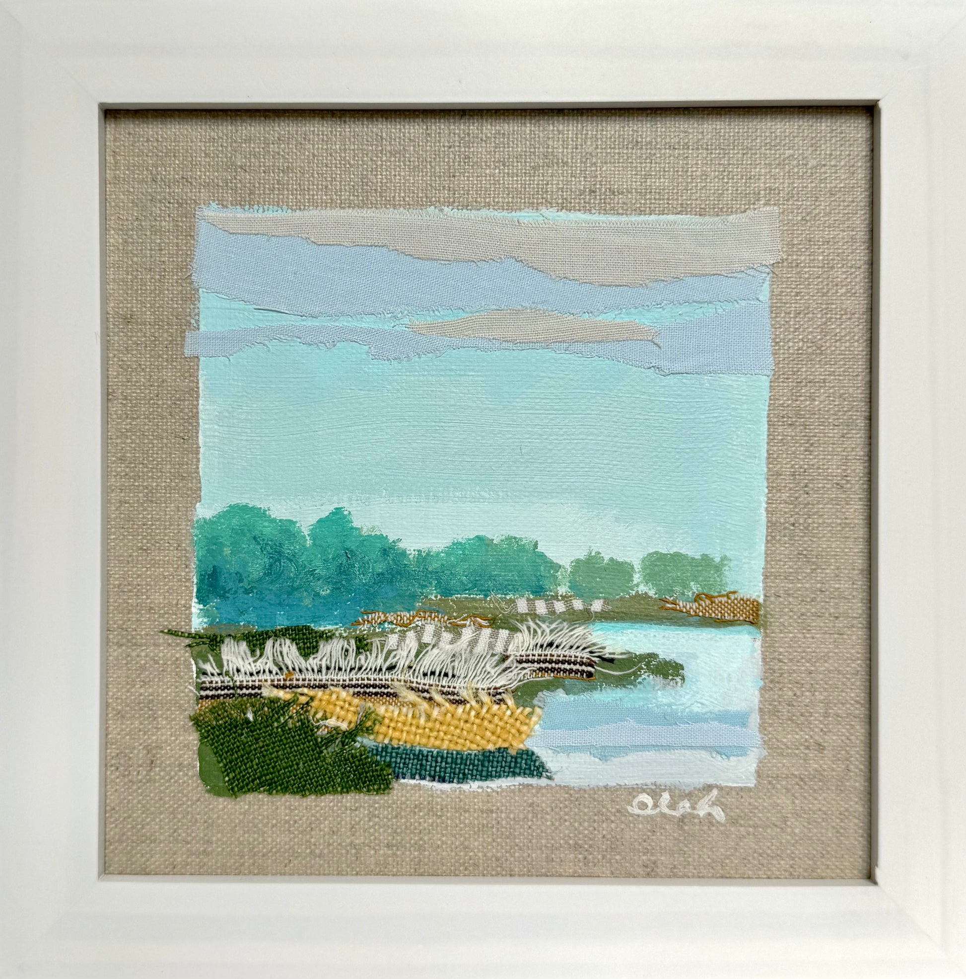 Palmetto Bluff, South Carolina, May River, Crossroads, marsh, golf course, blue and green, trees, golf, fields, farm, country, Seersucker, gingham, cotton, green, blue, shades of blue, ocean, dreamscape, landscape, abstract, abstracted landscape, coastal modern, collage, fabric, textiles, texture, fringe, thread, quilt, fiber art, Charleston artist