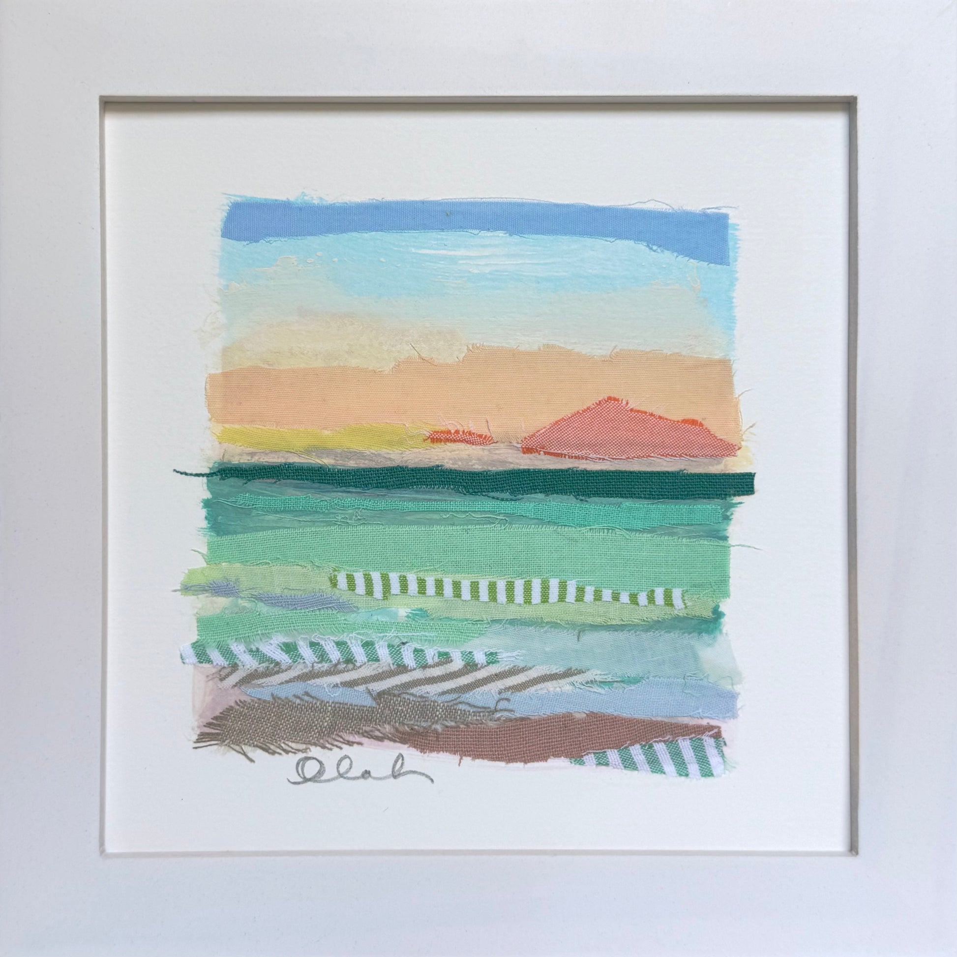 mint, orange, pink, turquoise, shore, shoreline, Seersucker, gingham, cotton, linen, blue, stripes, ocean, neutral, pastel, dreamscape, seascape, beach, landscape, Florida, coastal, sail, harbor, abstracted landscape, seascape, gulf coast, Atlantic, coastal modern, collage, fabric, textiles, quilt, fiber art