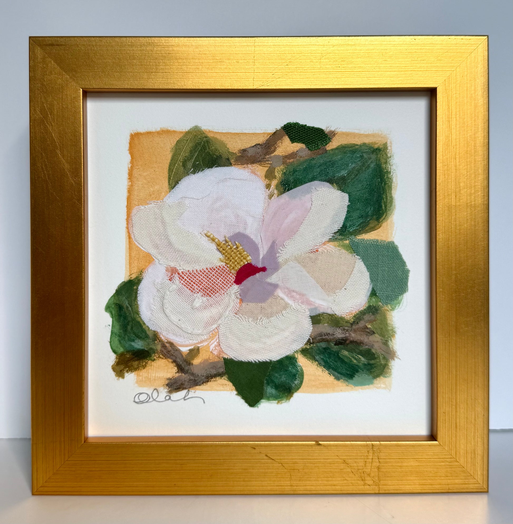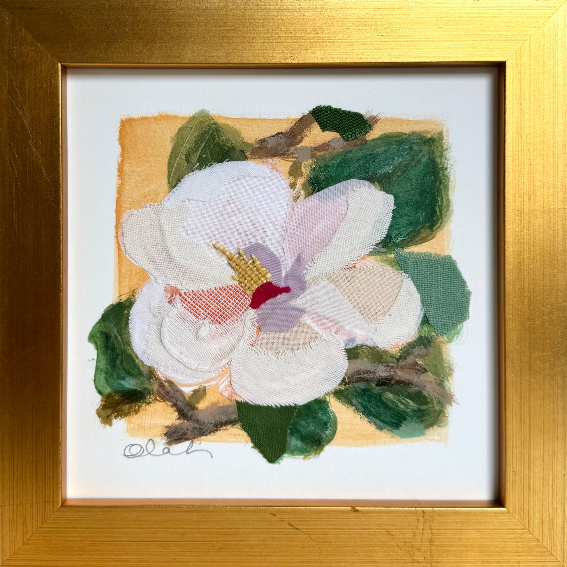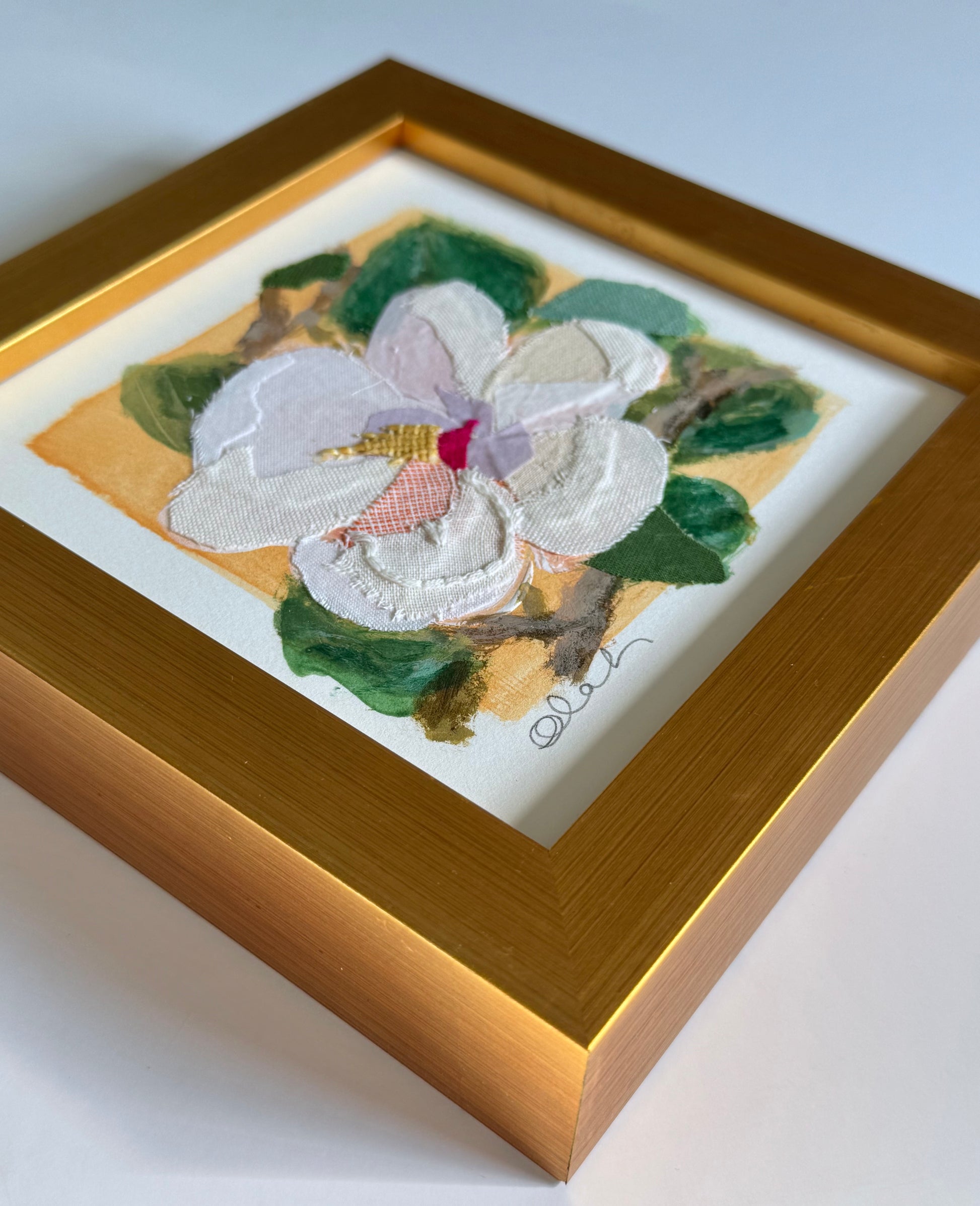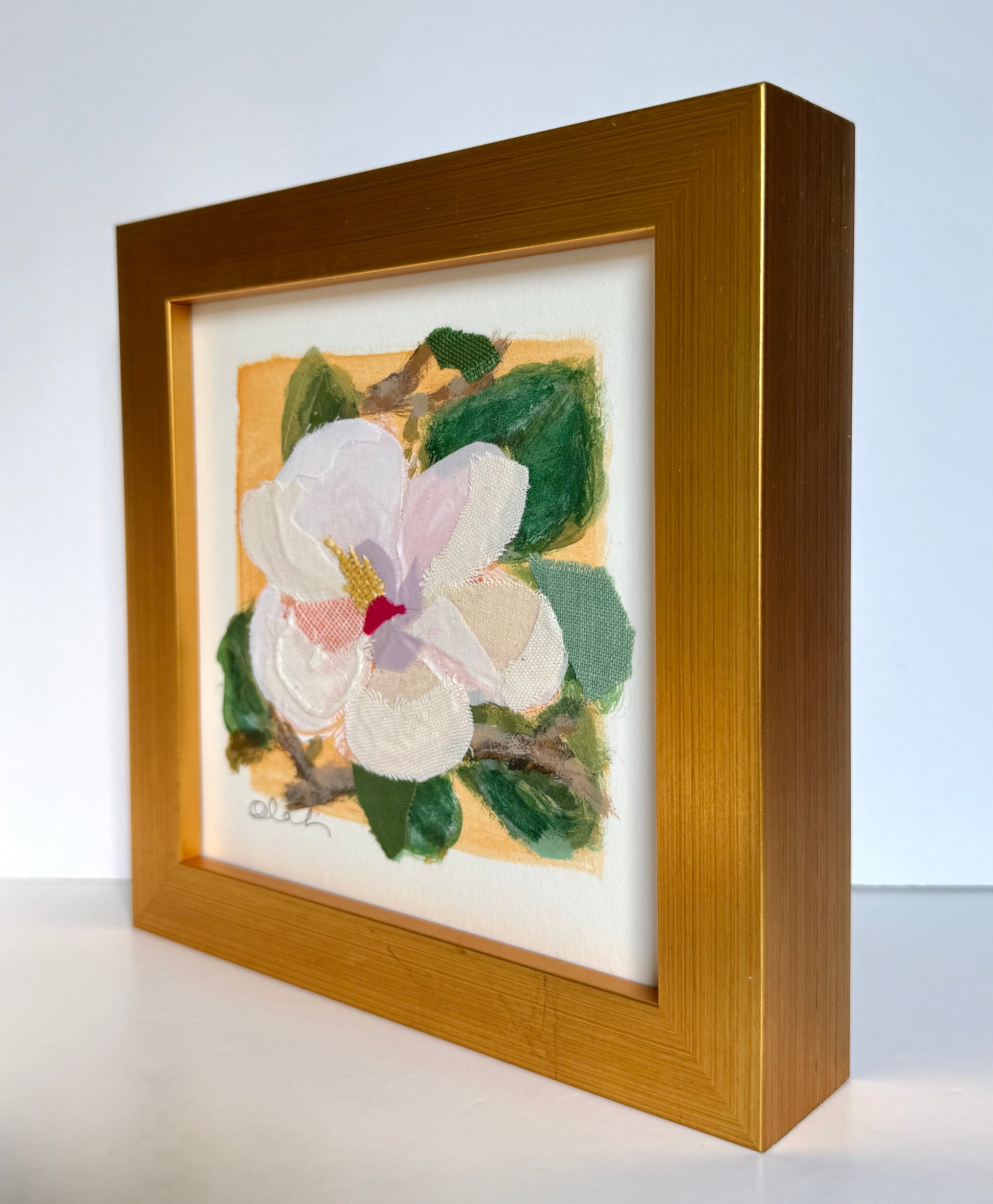 Acrylic + Textiles on Fabriano Paper, Acrylic Glass Cover, Gold-Leaf Wood Frame, Ready to hang or sit on a shelf