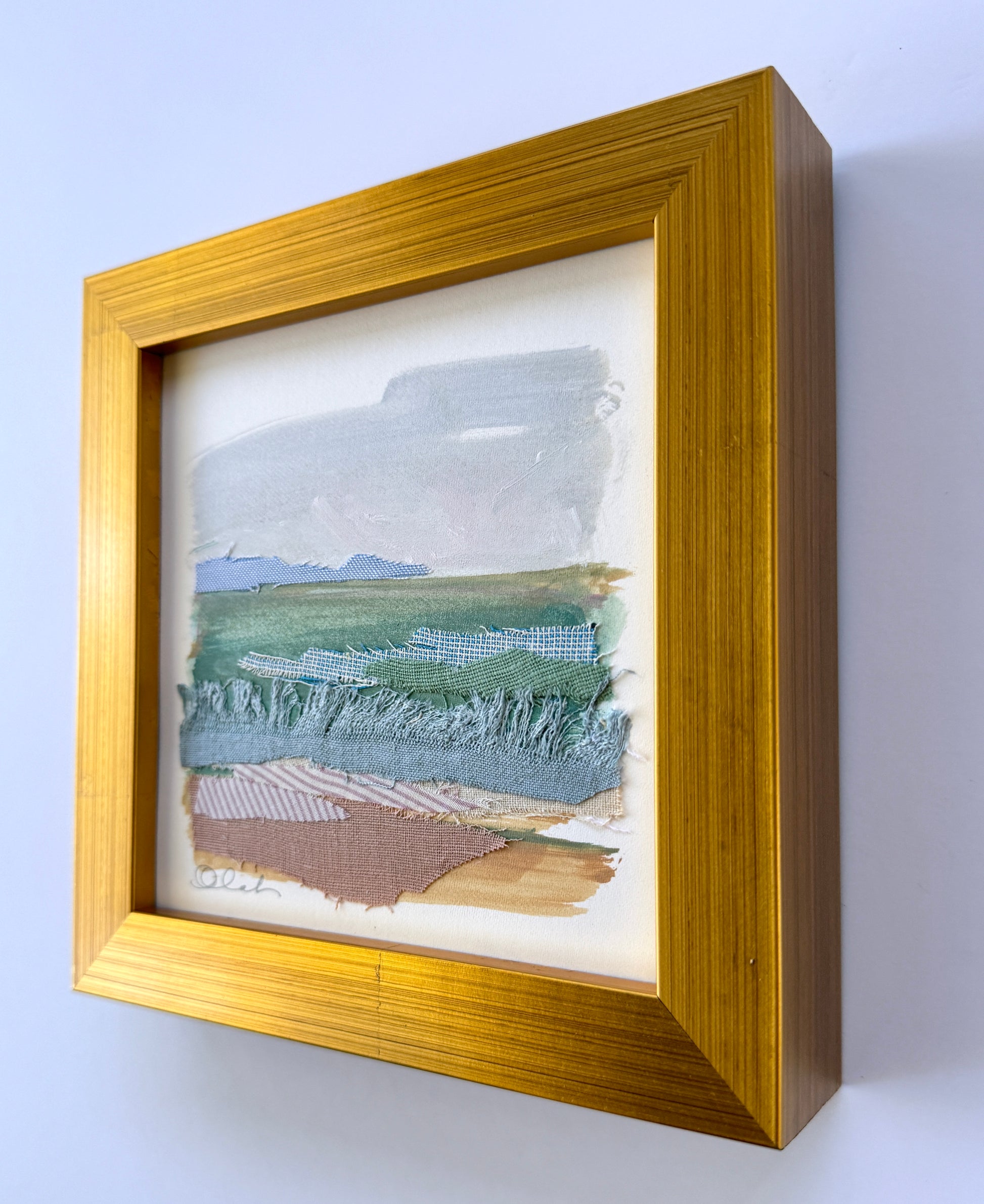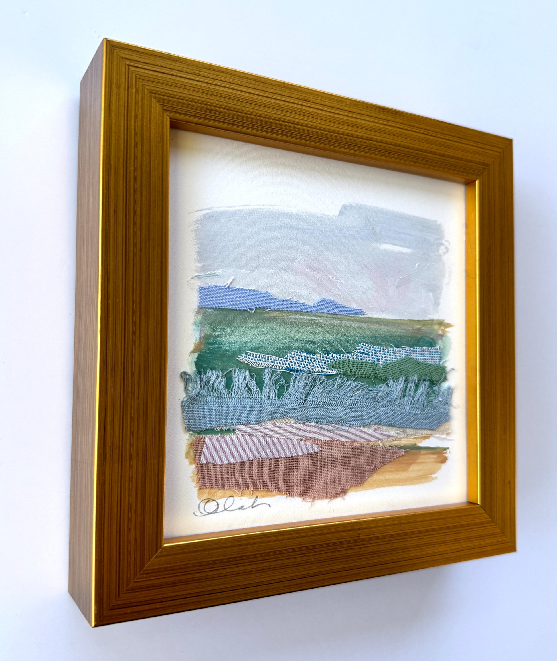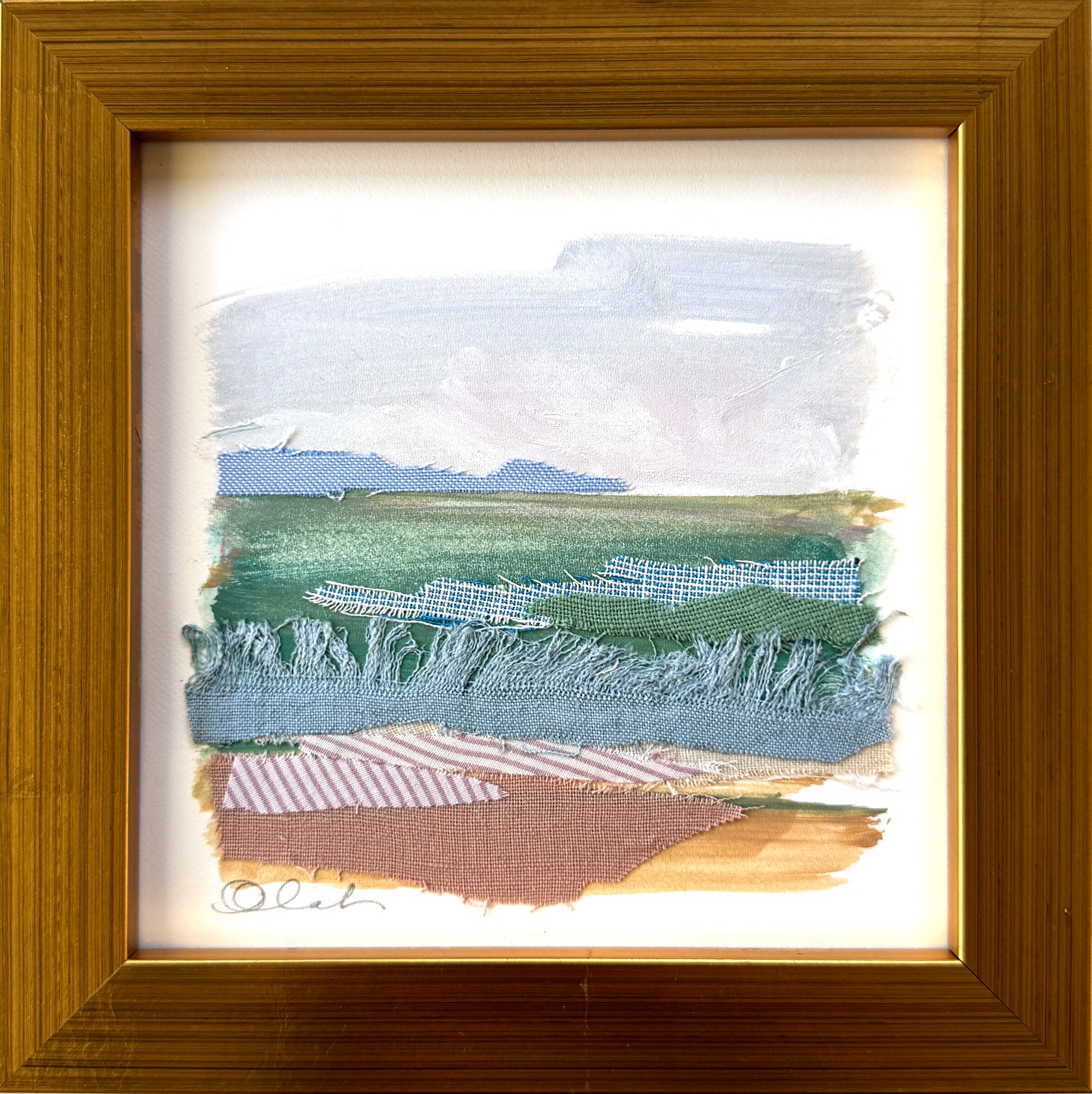Lowcountry, mountains, marsh, paper anniversary, cotton anniversary, linen anniversary, green, chartreuse, pink, blue, fields, pink and white, shore, shoreline, Seersucker, cotton, blue stripes, blue, shades of blue, ocean, blue and neutral, pastel, dreamscape, South Carolina, North Carolina, Florida, Georgia, river, lake, coastal, sea, seascape, golf course, abstract, abstracted landscape, coastal modern, collage, fabric, textiles, texture, quilt
