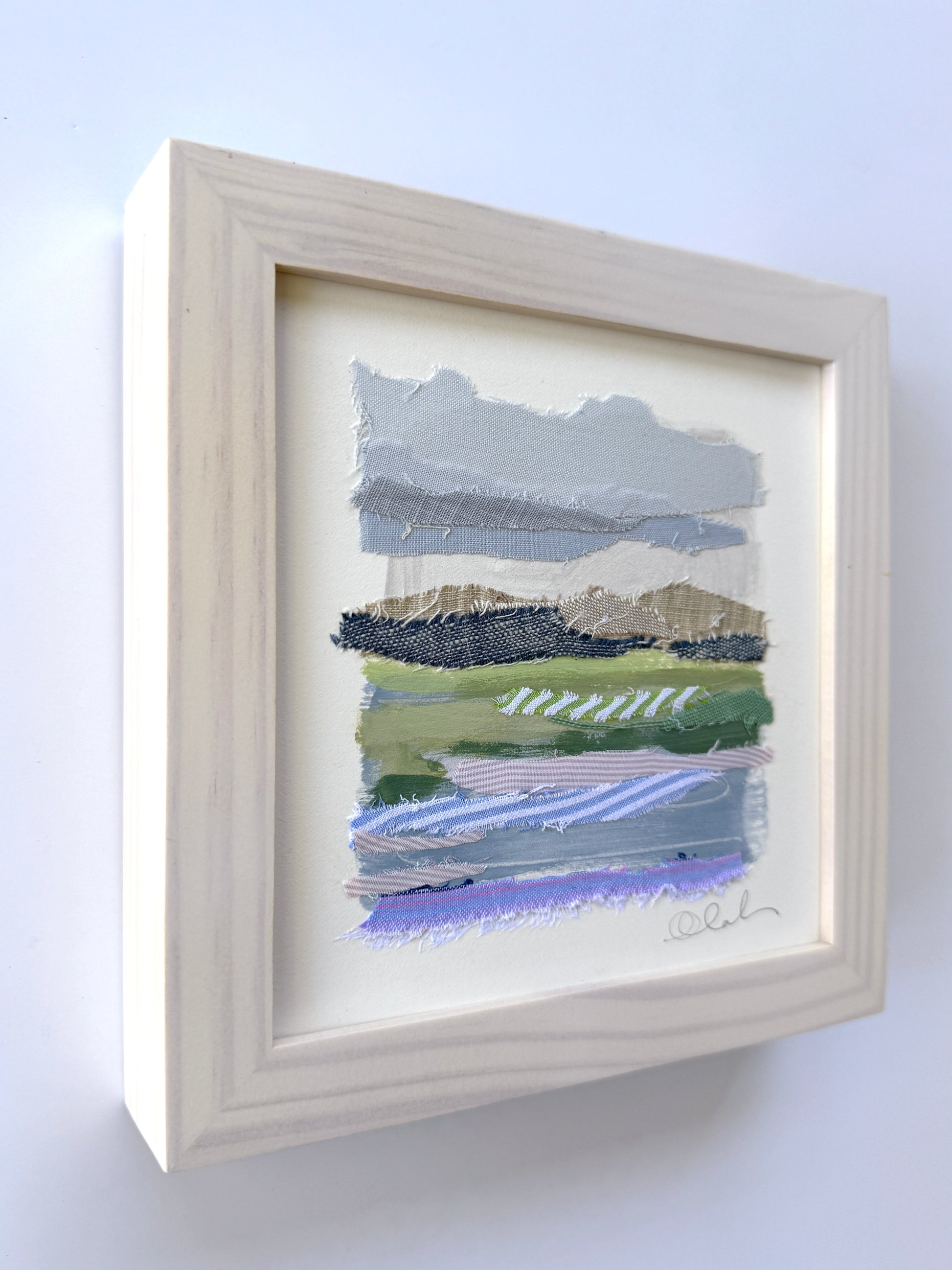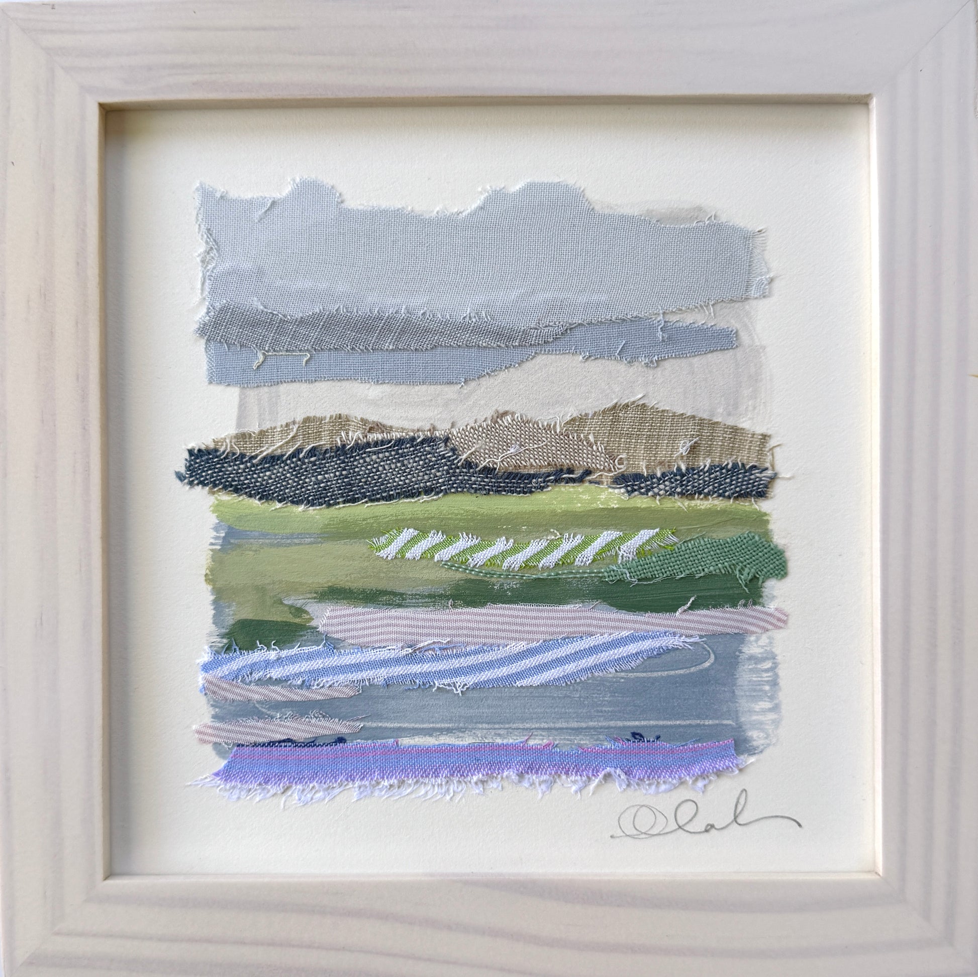 Lowcountry, mountains, marsh, paper anniversary, cotton anniversary, linen anniversary, green, chartreuse, pink, blue, fields, pink and white, shore, shoreline, Seersucker, cotton, blue stripes, blue, shades of blue, ocean, blue and neutral, pastel, dreamscape, South Carolina, North Carolina, Florida, Georgia, river, lake, coastal, sea, seascape, golf course, abstract, abstracted landscape, coastal modern, collage, fabric, textiles, texture, quilt