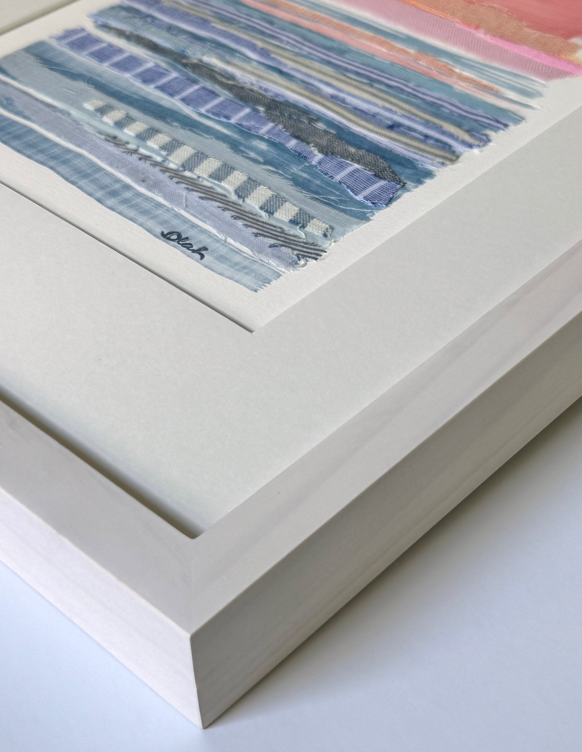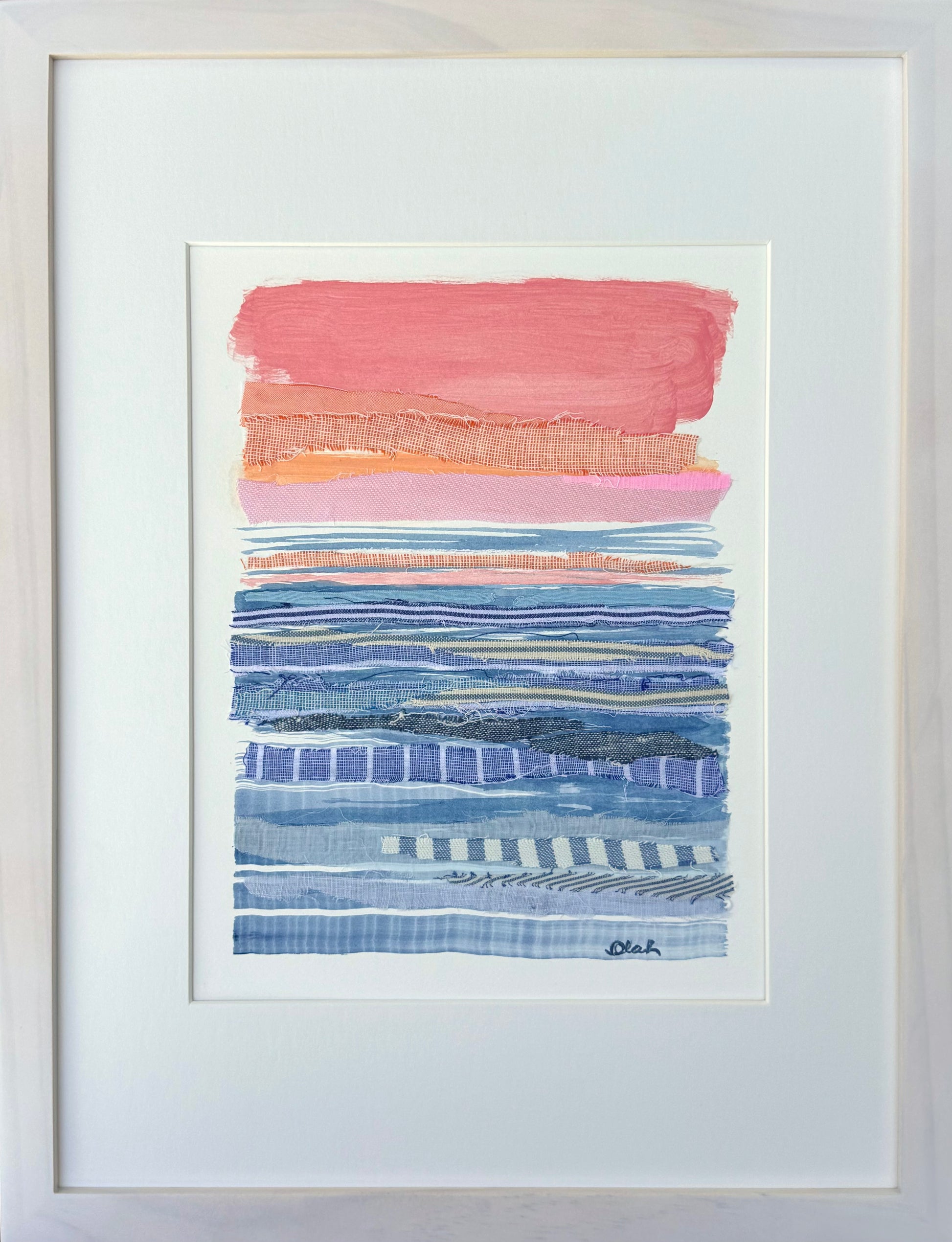 East Coast, Atlantic Ocean, East Hampton, Napeague Bay, Gardiners Bay, pink and blue, Seersucker, stripes, cotton, linen, silk, chartreuse, seascape, abstract landscape, Charleston Artist, coastal modern, collage, fabric, textiles, fiber art, painting