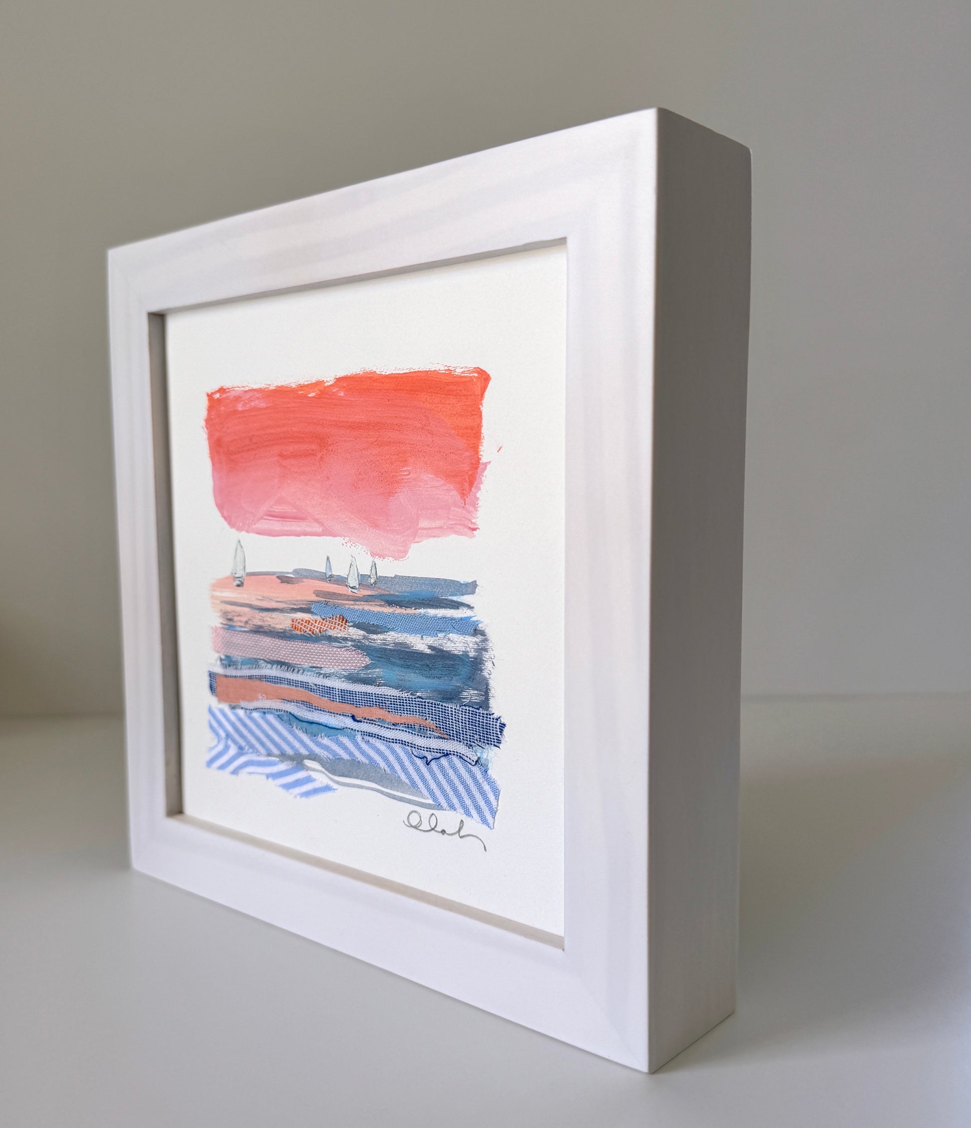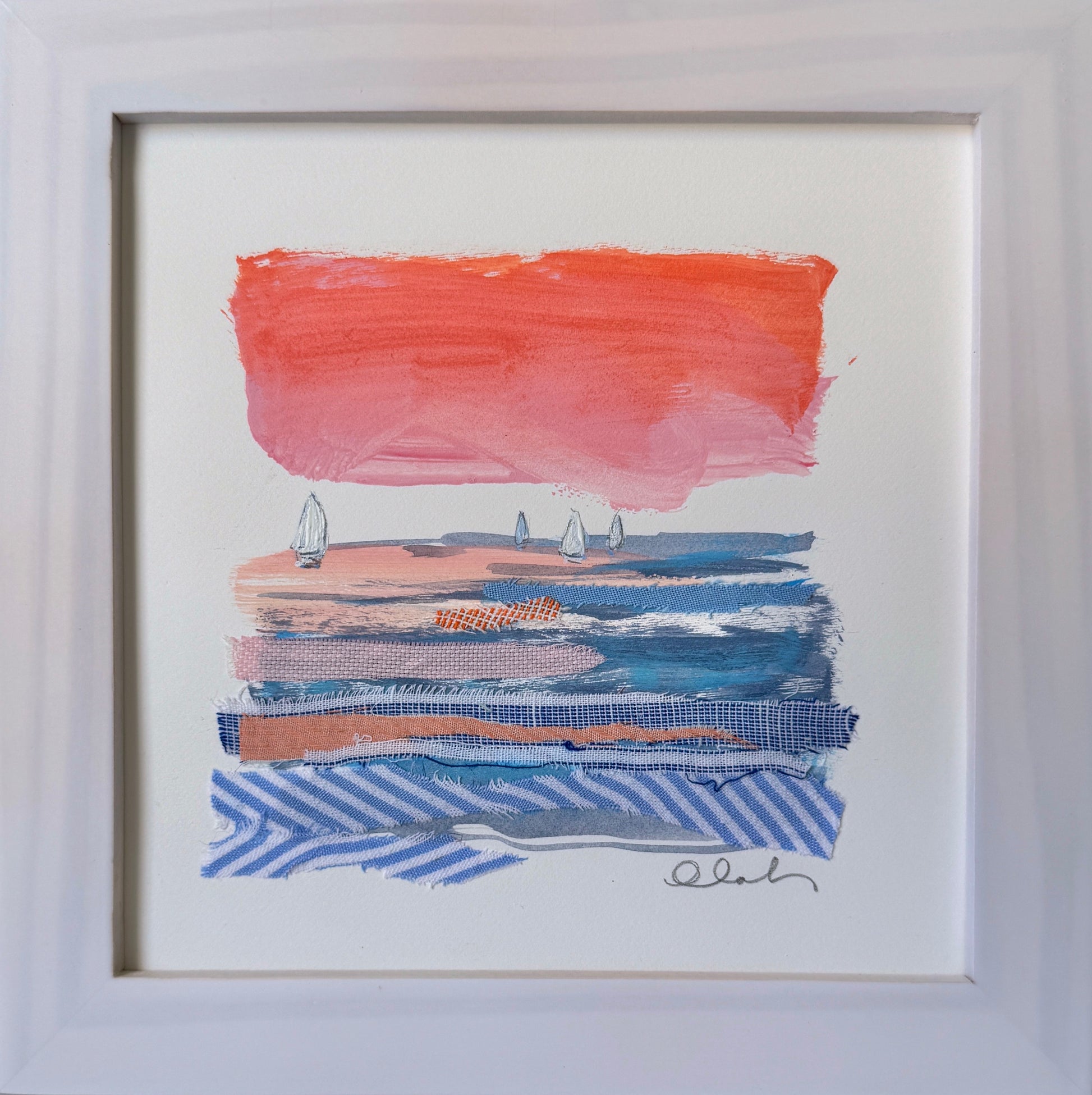 coral, pink and red, blue and pink, blue and white, shore, shoreline, Seersucker, gingham, cotton, blue stripes, blue, shades of blue, ocean, blue and neutral, pastel, dreamscape, seascape, beach, landscape, Charleston, coastal, sail, sailboat, harbor, abstract, abstracted landscape, coastal modern, collage, fabric, textiles, quilt