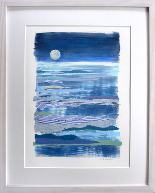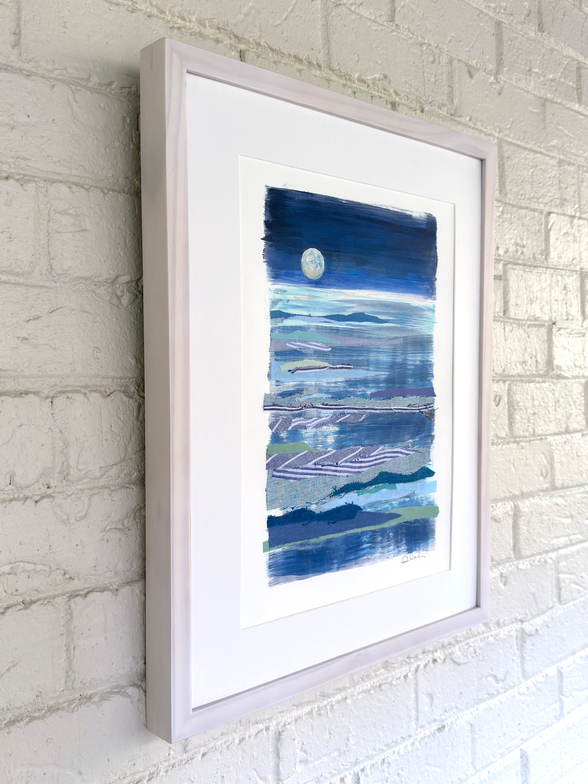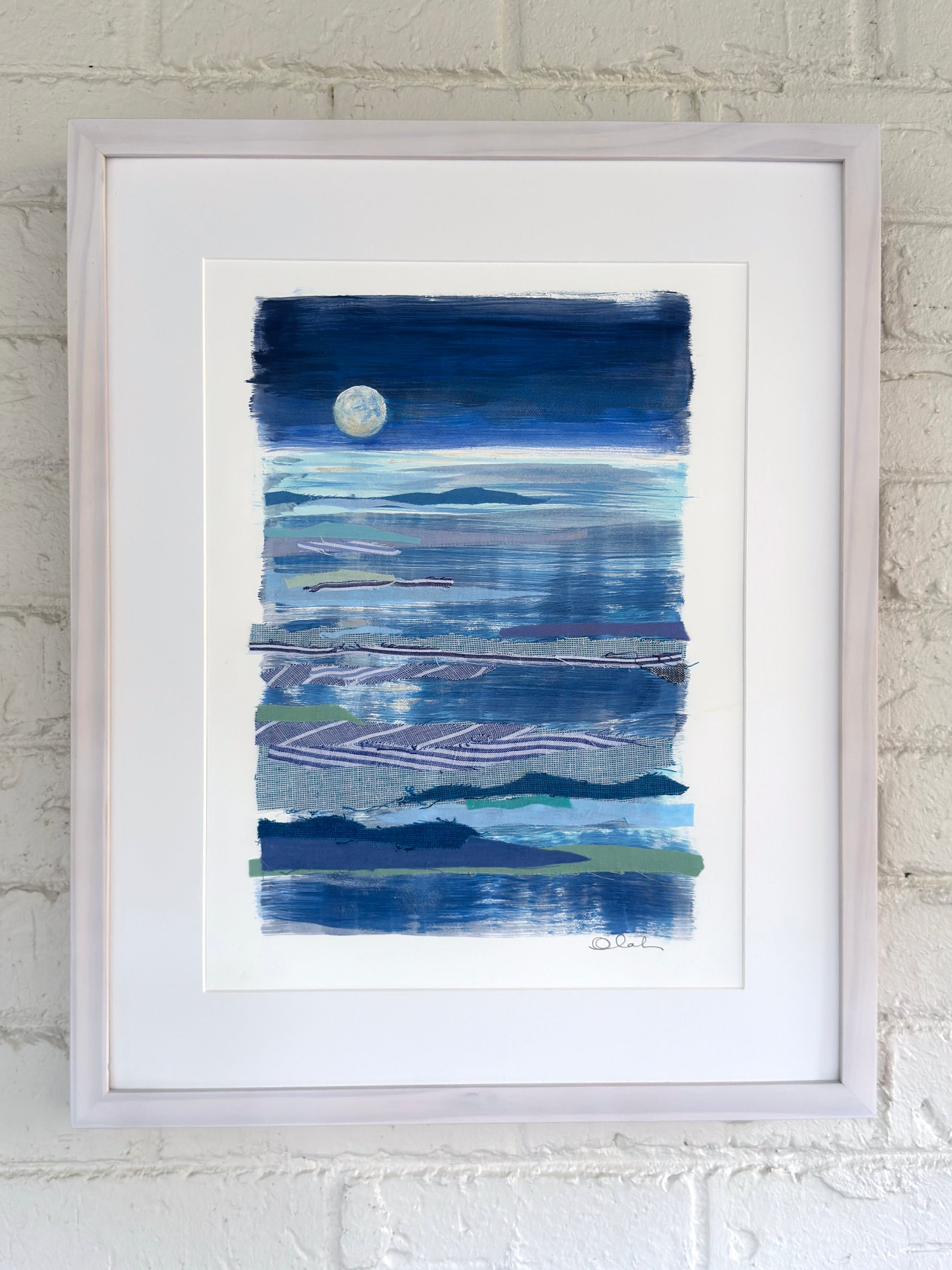 moon, full moon, night sky, ocean, Charleston, Lowcountry, South Carolina, sea, waves, seersucker, cotton, blue stripes, blue, shades of blue, blue and neutral, pastel, dreamscape, seascape, beach, coastal, harbor, abstract, abstracted landscape, coastal modern, collage, fabric, textiles, quilt, cotton anniversary, linen anniversary, paper anniversary