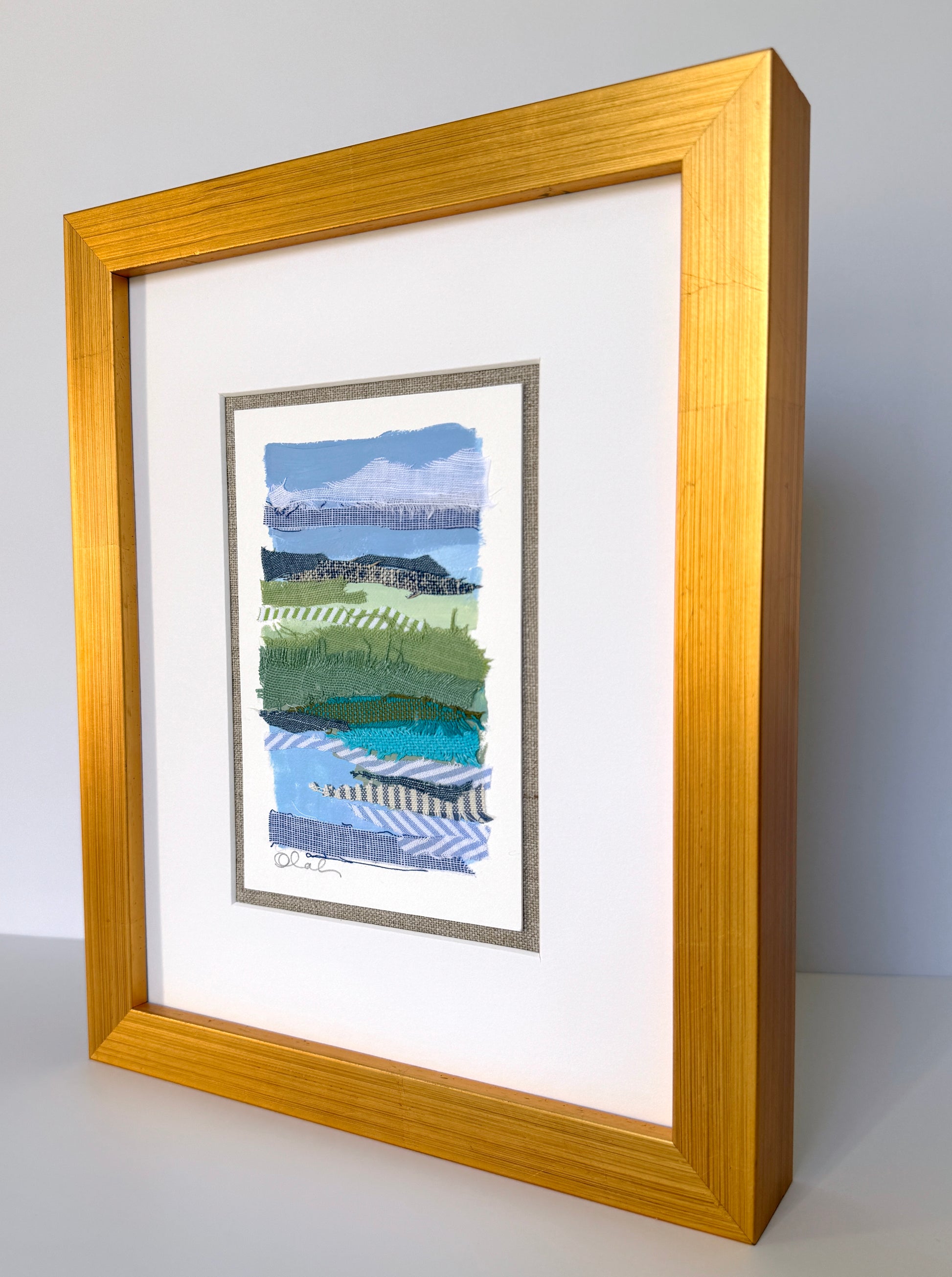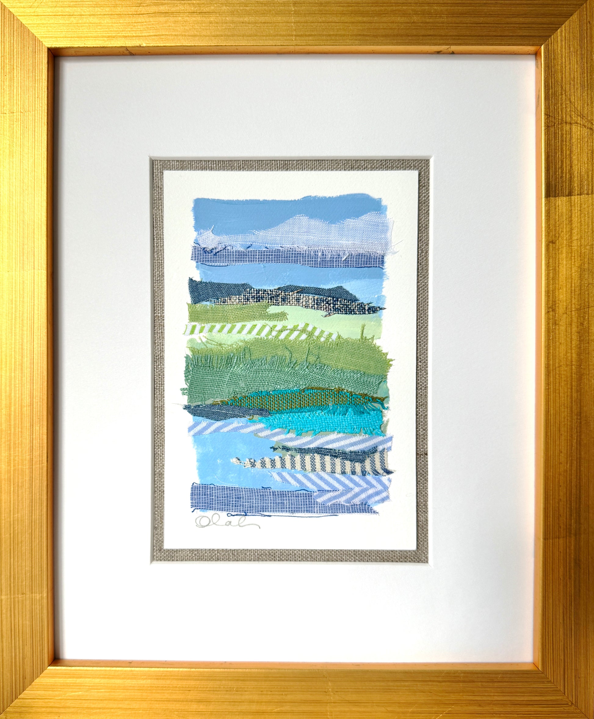 green, turquoise, blue and white, shore, shoreline, Seersucker, gingham, cotton, blue stripes, blue, shades of blue, ocean, blue and neutral, pastel, dreamscape, seascape, golf, fringe, string, beach, landscape, Charleston, coastal, sail, sailboat, harbor, abstract, abstracted landscape, coastal modern, collage, fabric, textiles, quilt