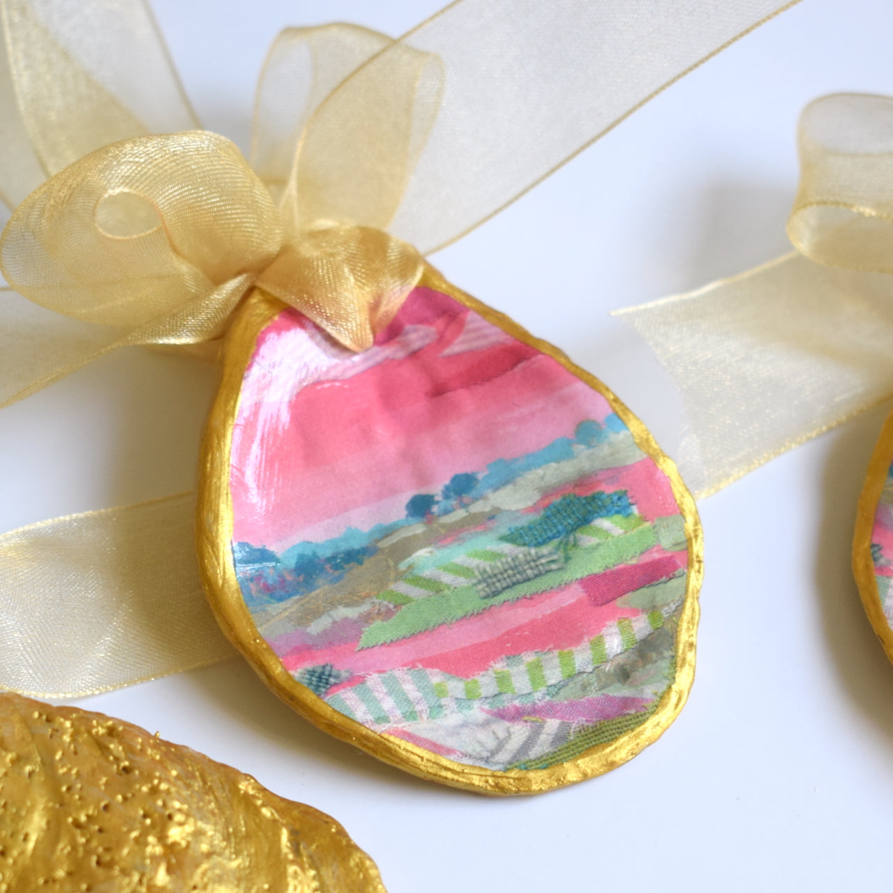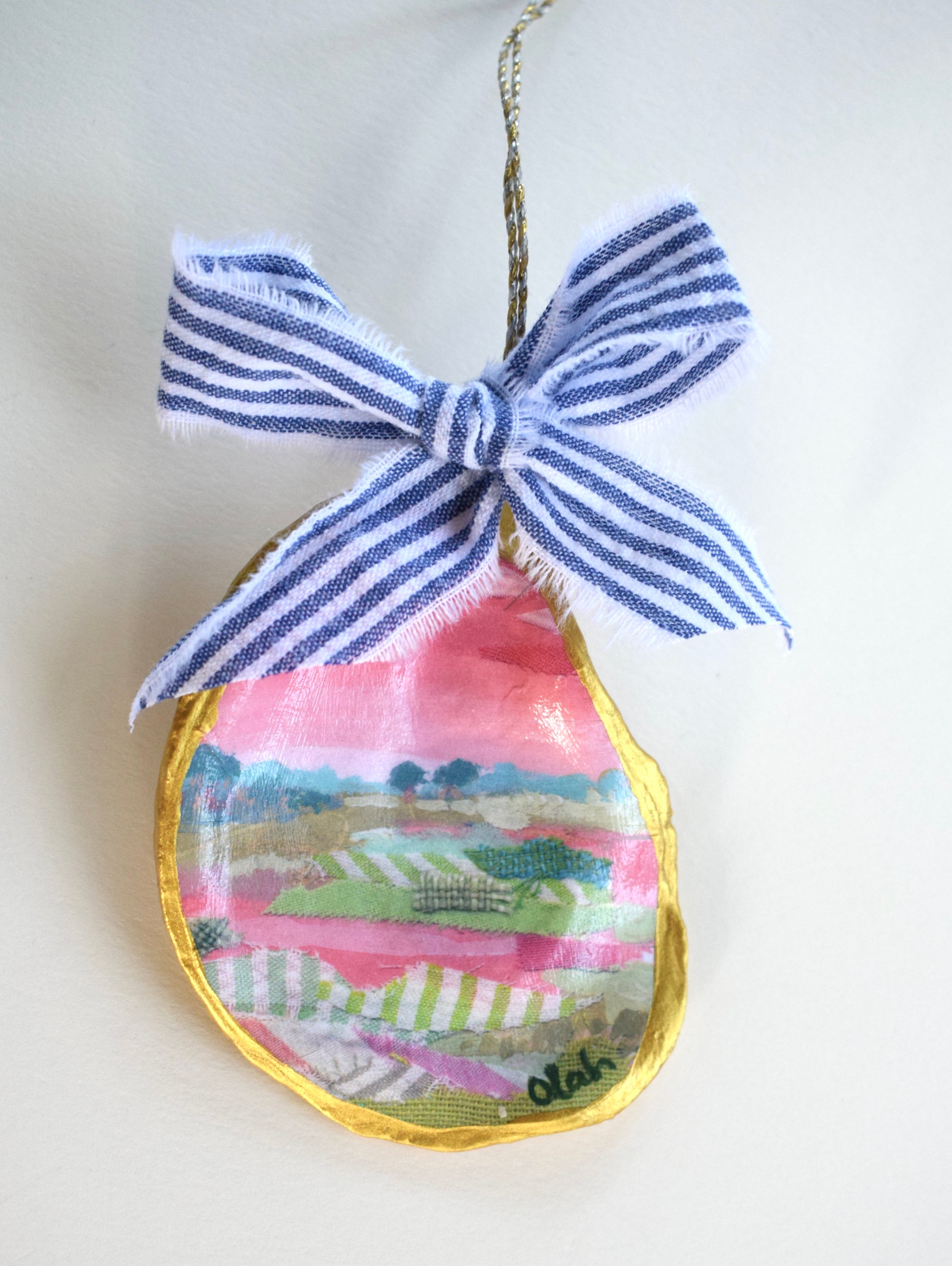 This oyster shell is decoupaged with a printed image of my original painting "Nine and Wine". In the image - a golf course along the marsh in South Carolina. Layers of textiles and shades of pink and coral with green and white seersucker are seen in the details.