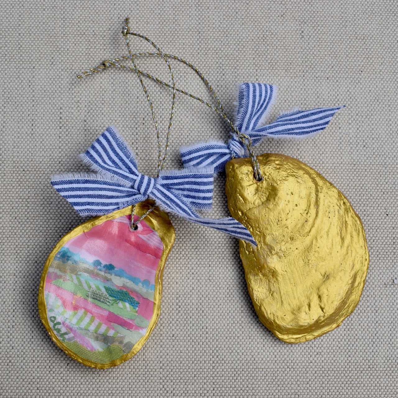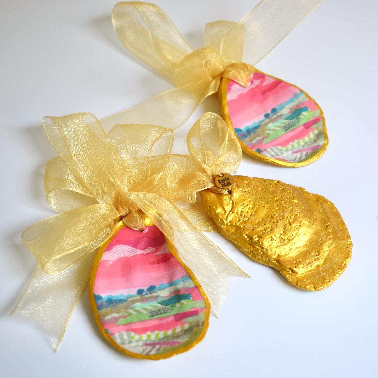 Oyster ornaments are perfect for your Holiday Decor. Hang them on the Christmas Tree or with your stockings. Give them as gifts or hang on a hostess bottle of Bubbly. Beautiful as a napkin holder or wedding gift.