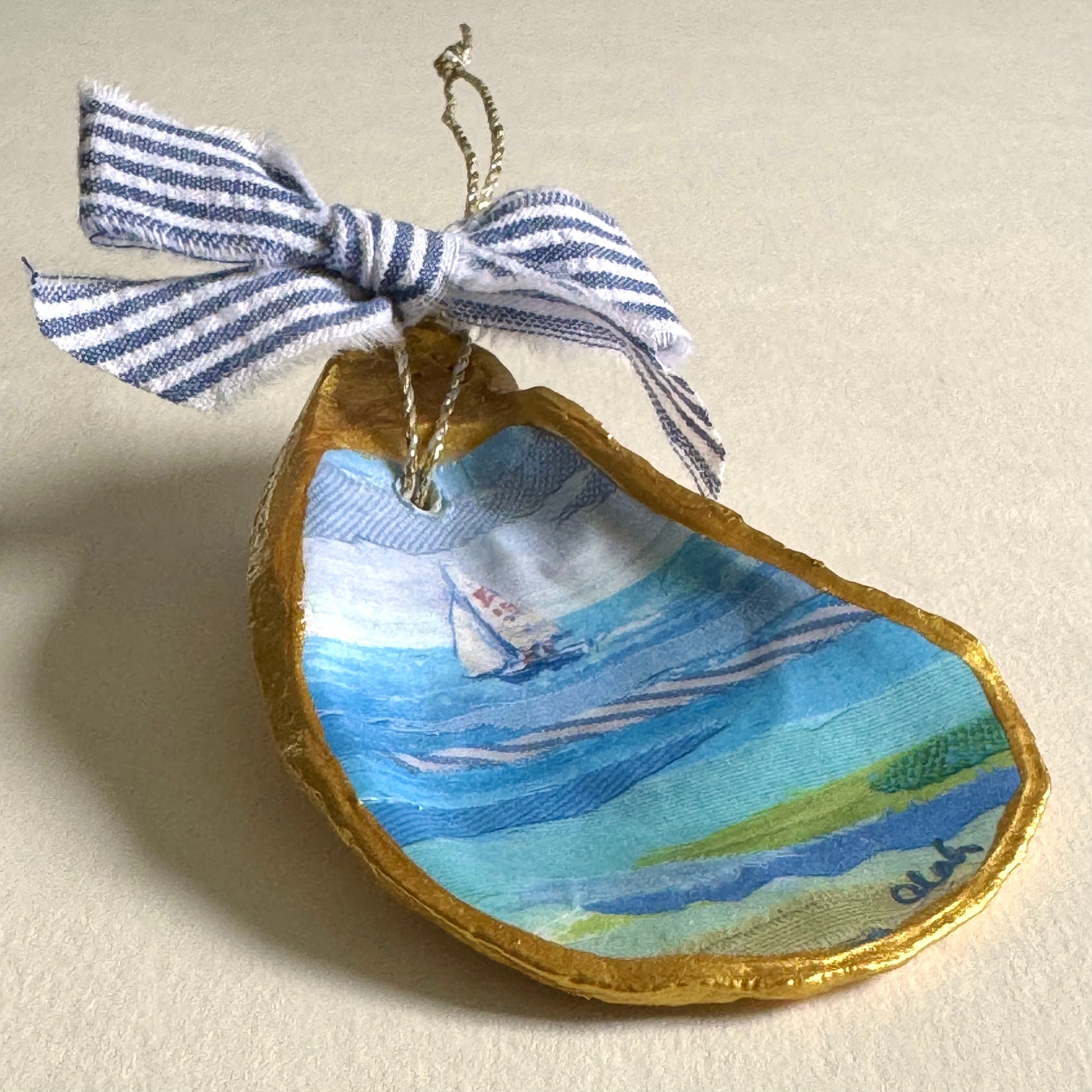 This oyster shell is decoupaged with a printed image of my original painting "Shoreline". In the image - a small sailboat finds the breeze in a coastal seascape.
