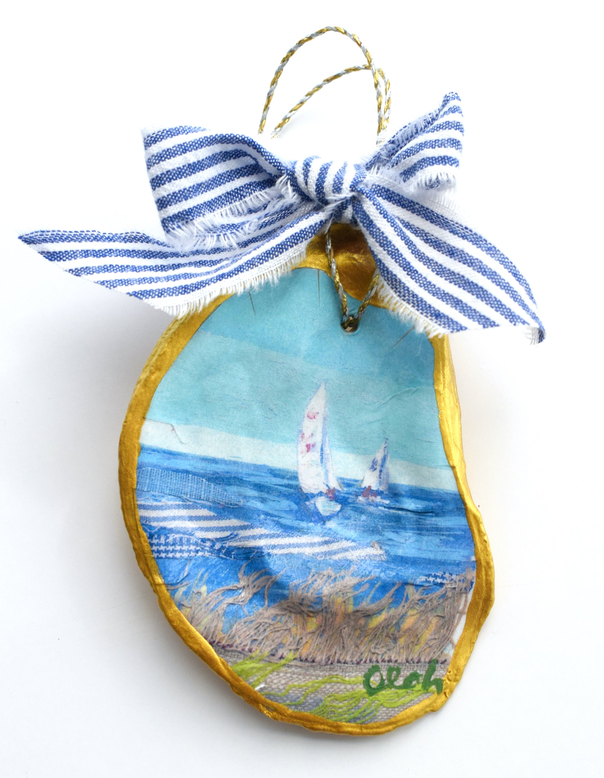 This oyster shell is decoupaged with a printed image of my original painting "Spartina Sisters". In the image - two small sailboats are tacking near the harbor in Charleston. Linen fringe and threads create a layer of spartina grasses near the shoreline.