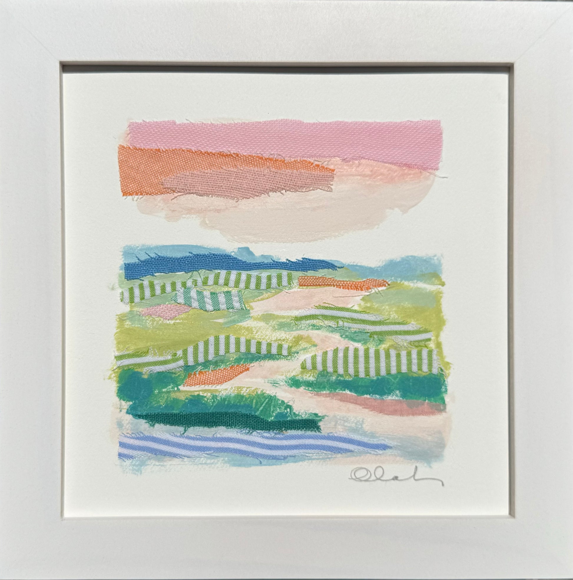 Palmetto Bluff, bluffton, hilton head, South Carolina, Pink and mint, blue and green, blue and white, shore, shoreline, marsh, Seersucker, gingham, cotton, blue stripes, blue, shades of blue, ocean, blue and neutral, pastel, dreamscape, seascape, marsh, beach, lake, river, landscape, Charleston artist, coastal, harbor, abstract, abstracted landscape, coastal modern, collage, fabric, textiles, quilt