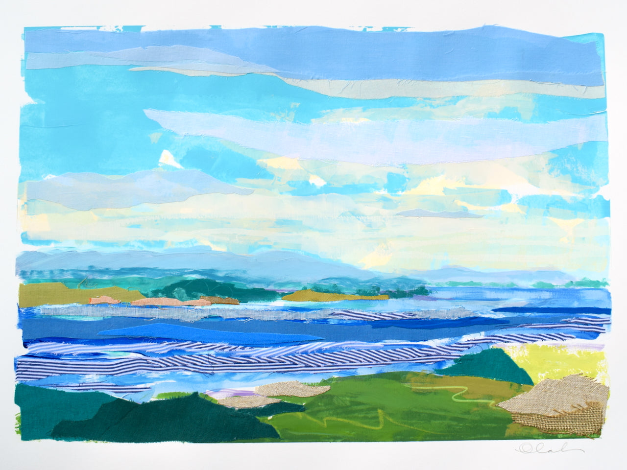 This Giclee Fine Art Print is created from my original mixed media painting. The acrylic brushstrokes along with layers of fabric, seersucker cotton, vintage textiles, and hand-dyed linen are shown in crisp definition. Each print has my artist signature on it in the lower left or right corner.