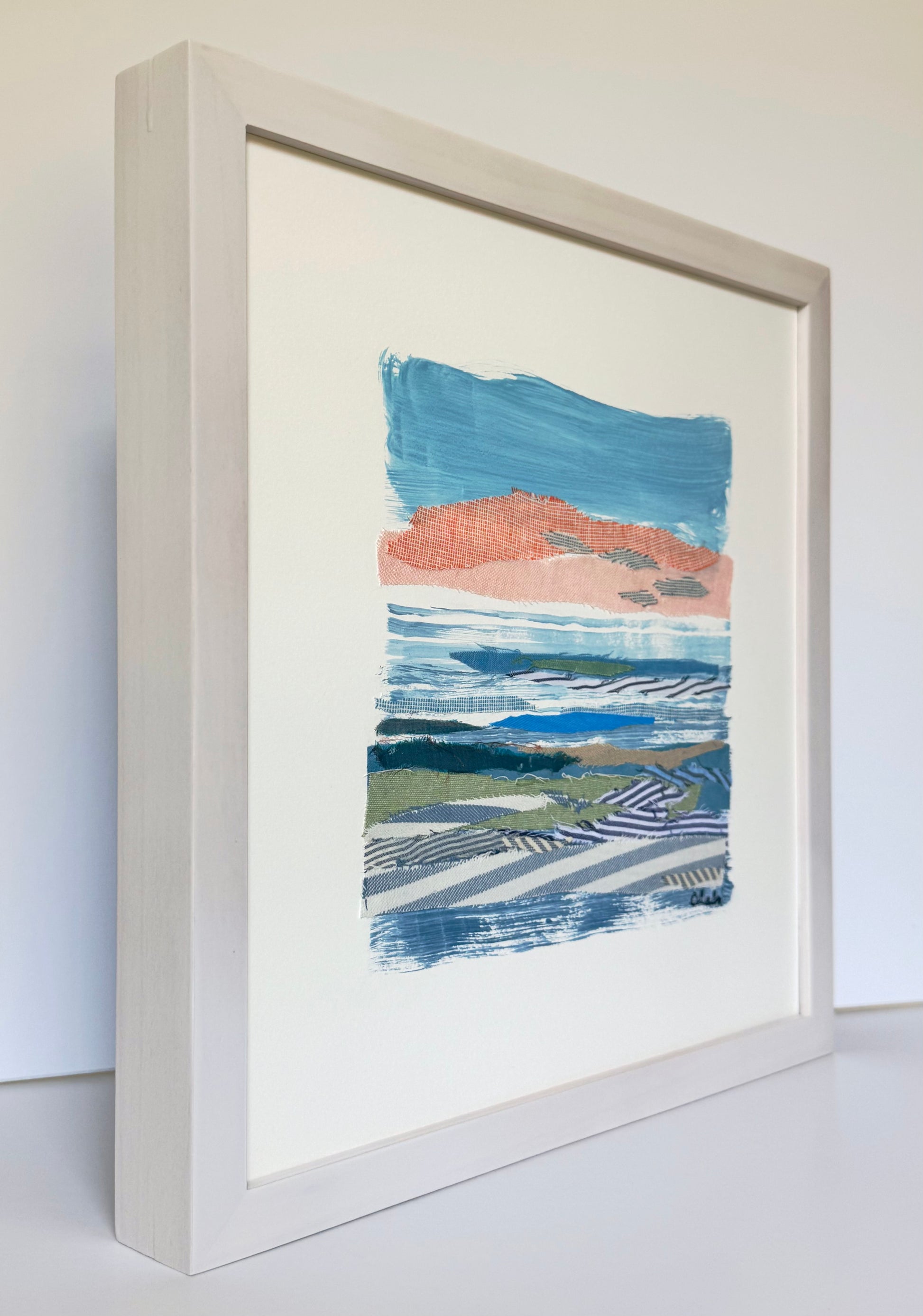 navy, blue and pink, blue and white, shore, shoreline, Seersucker, cotton, linen, blue, stripes, ocean, dreamscape, seascape, beach, landscape, Charleston, coastal, sail, harbor, abstracted landscape, seascape, east coast, Atlantic, coastal modern, collage, fabric, textiles, quilt, fiber art