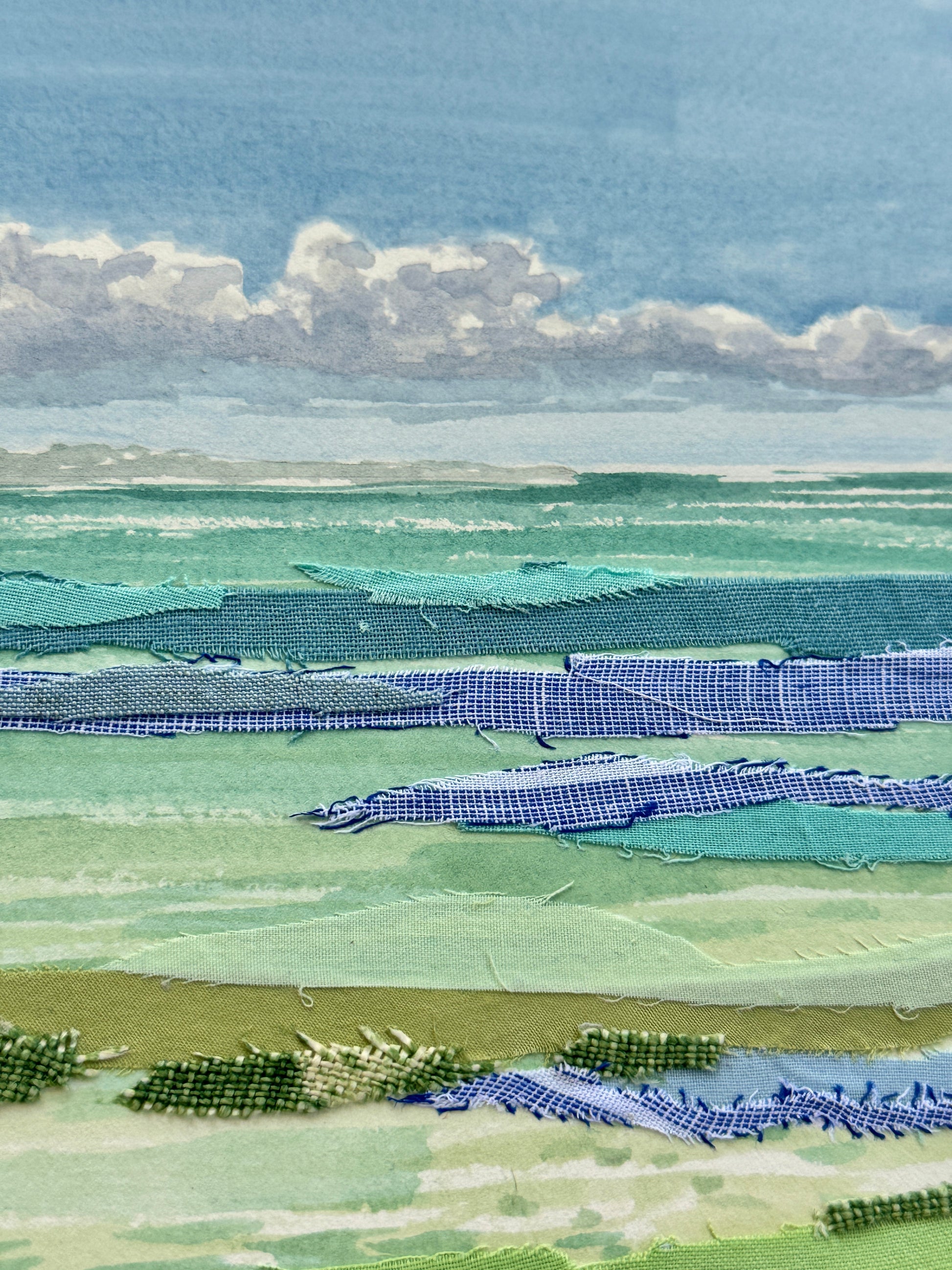 Cotton, linen, texture, blue, shades of teal, shades of blue, blue stripes, dreamscape, seascape, coastal, abstract, abstracted landscape, coastal modern, fabric, textiles, seersucker, marsh, ocean, beach, clouds