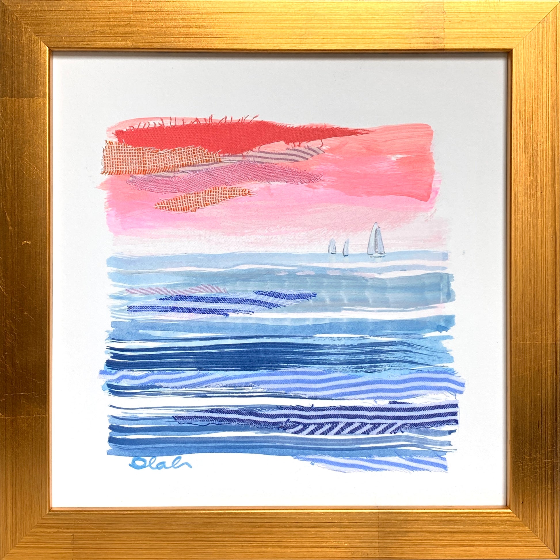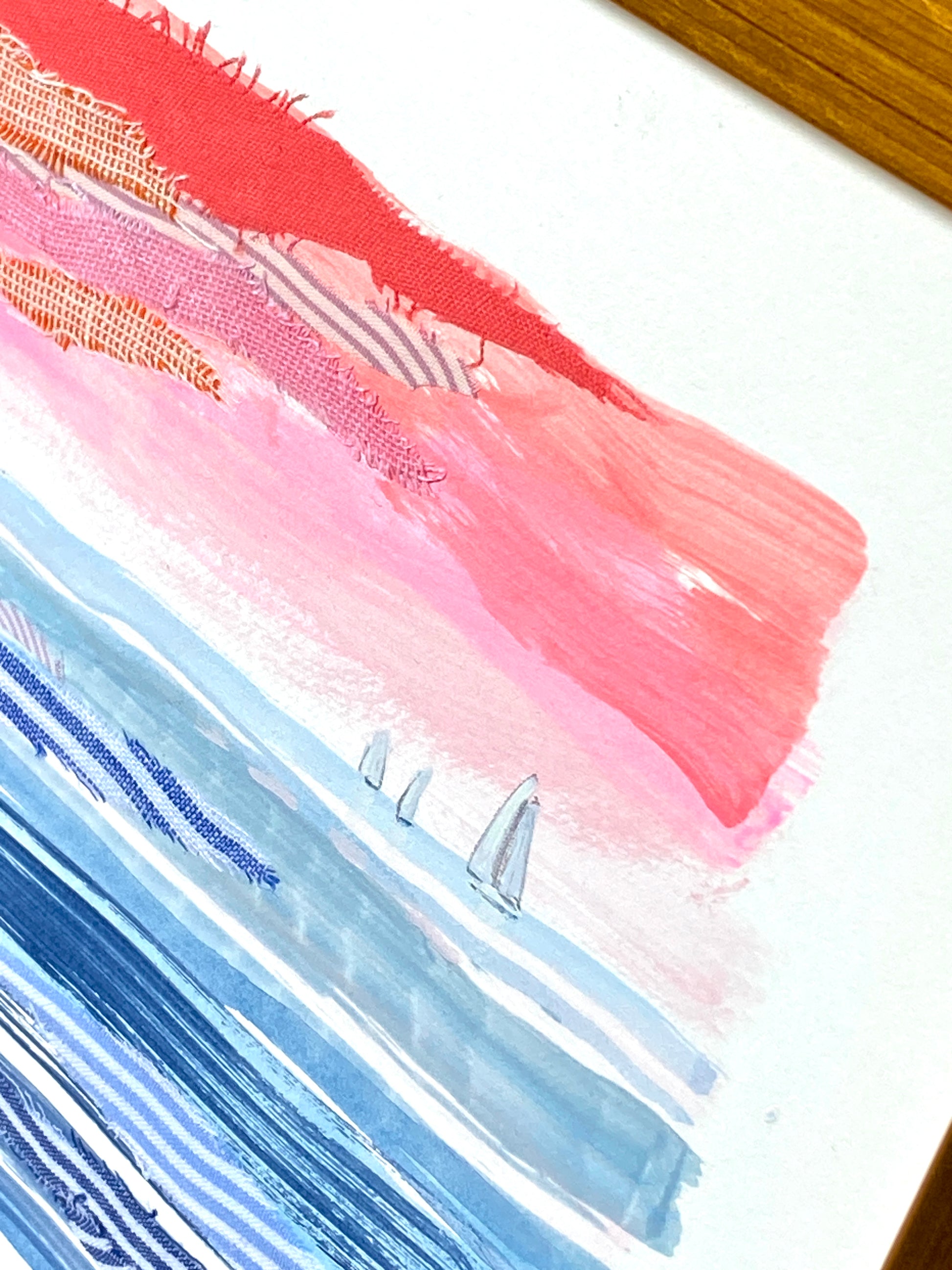 blue, sea, blue and pink, coral, pinks, pink and red, indigo, shore, shoreline, Seersucker, cotton, blue stripes, blue, shades of blue, ocean, blue and neutral, pastel, dreamscape, seascape, beach, Charleston, coastal, sail, sailboats, harbor, abstract, abstracted landscape, coastal modern, collage, fabric, textiles, quilt, fabric