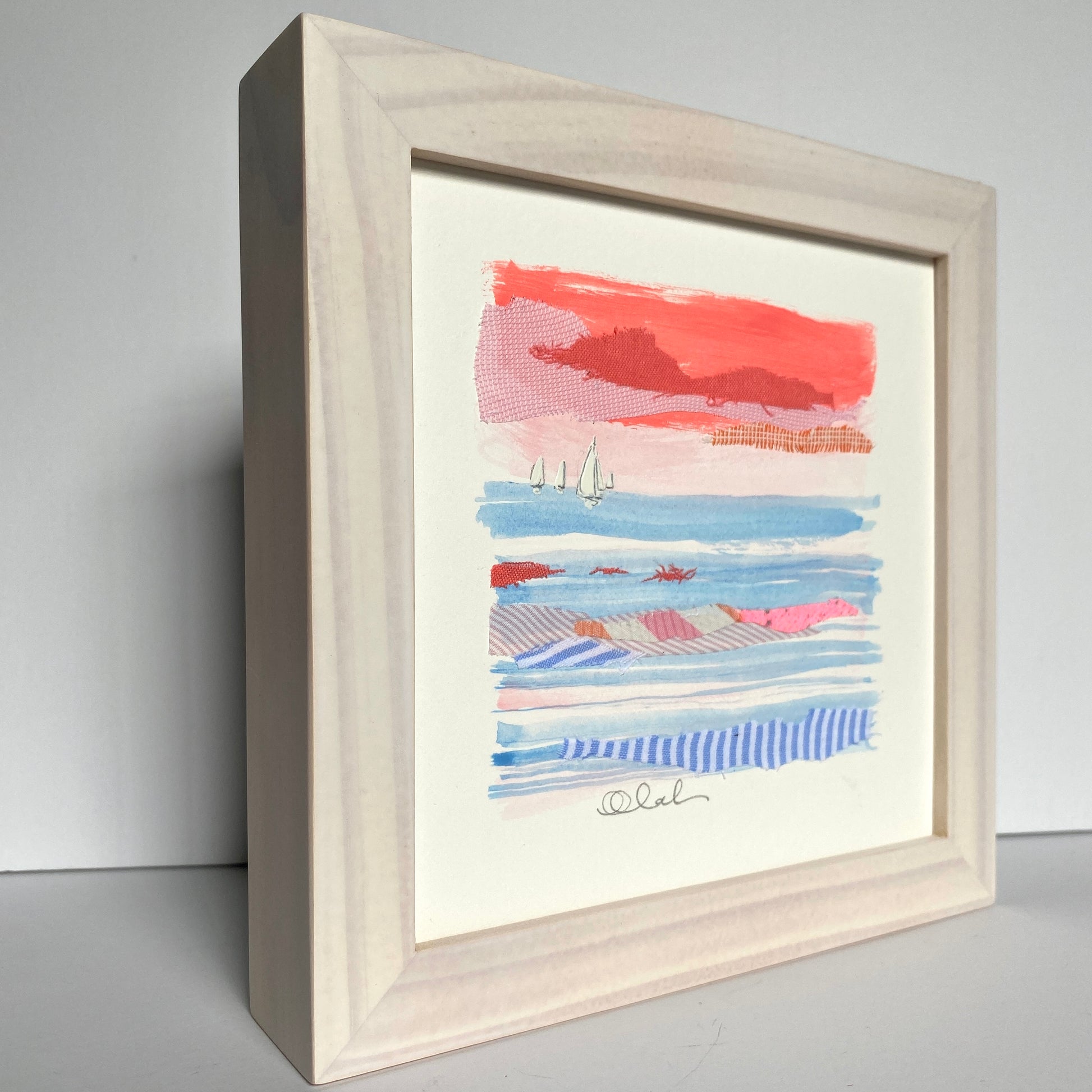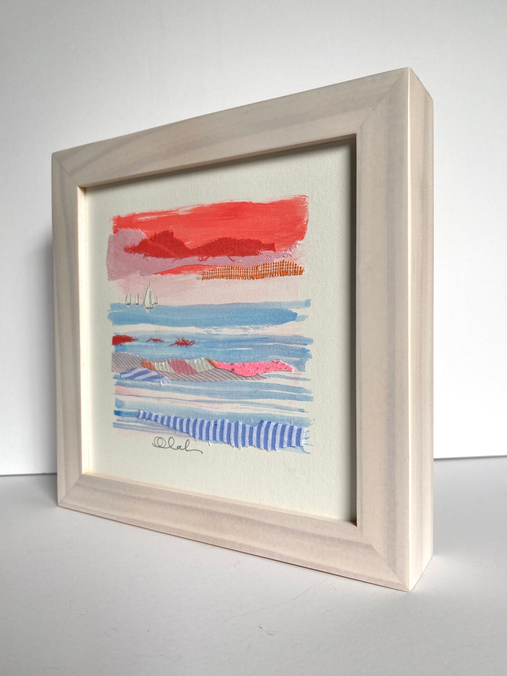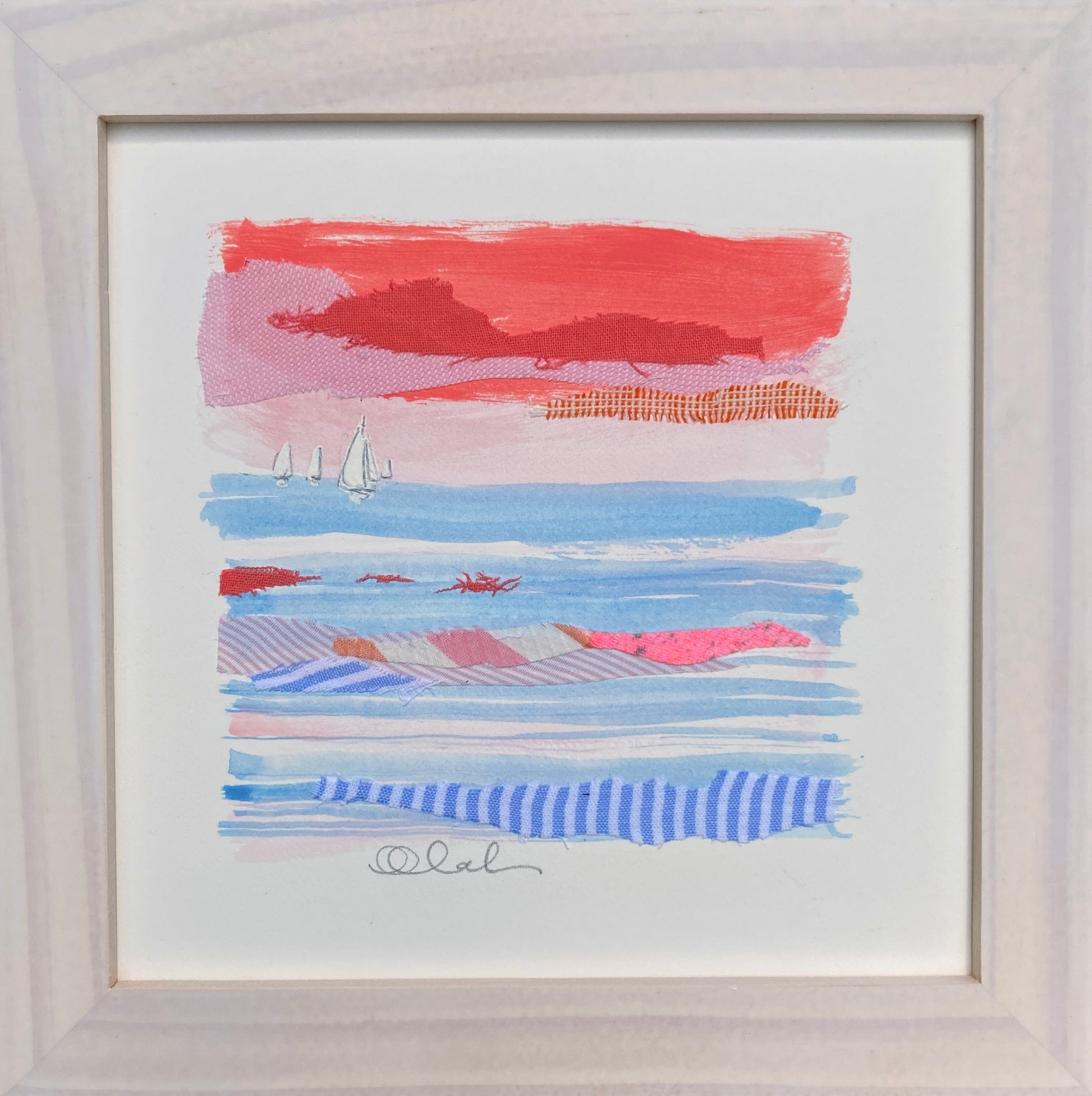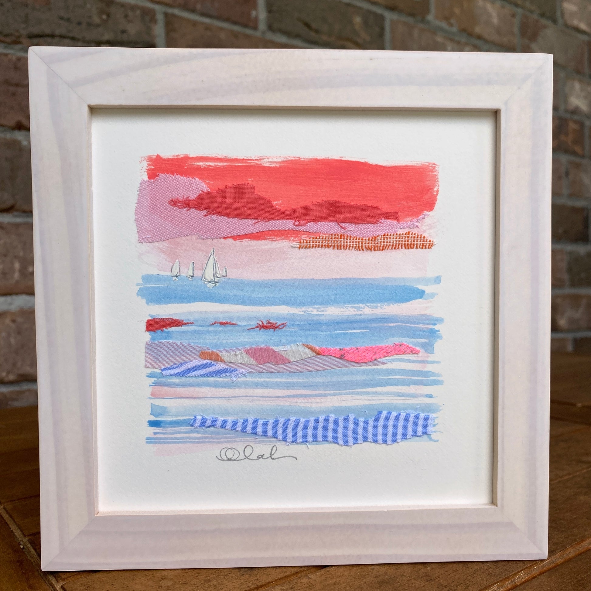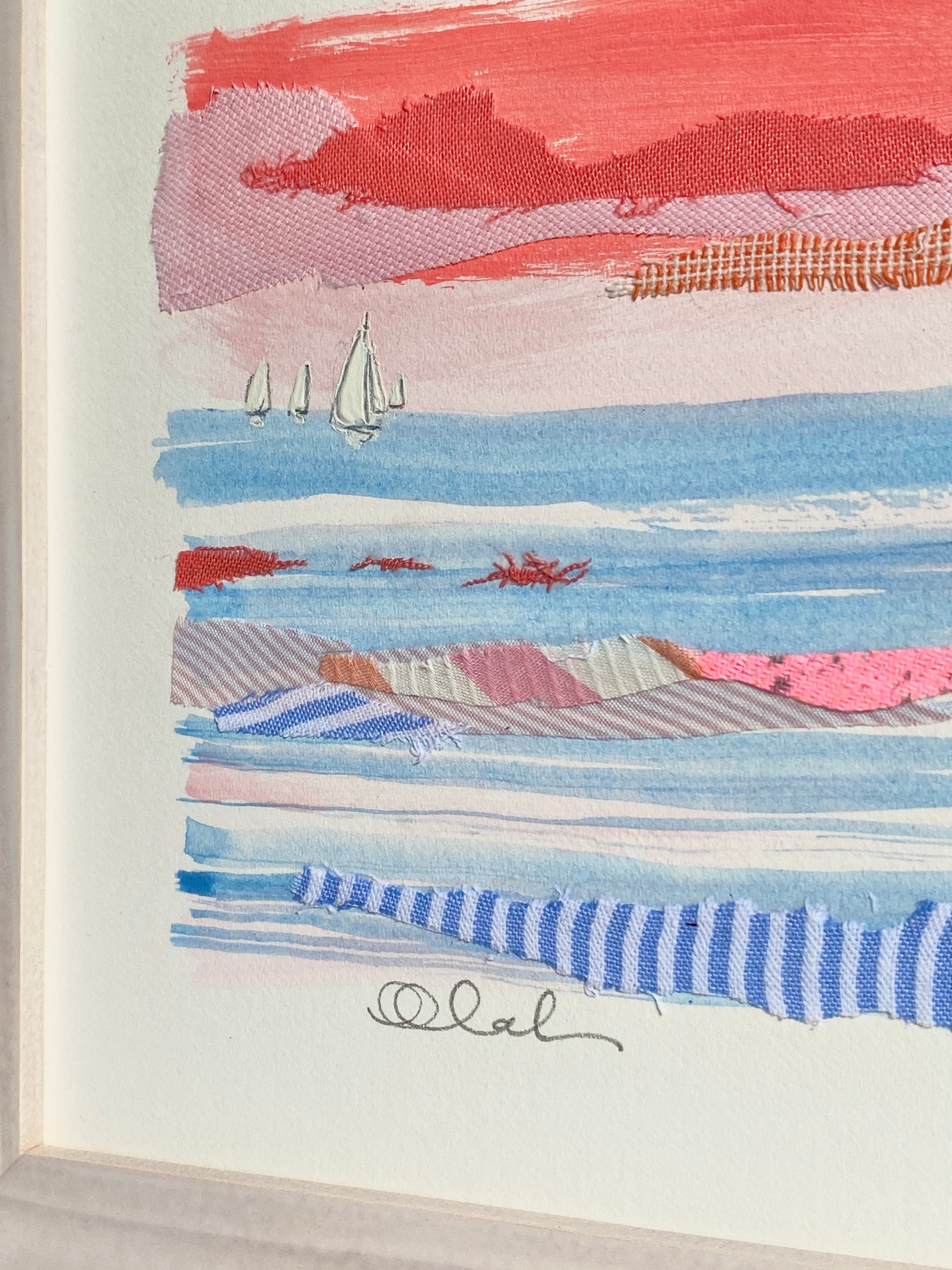 Seersucker, cotton, blue stripes, pink and blue, shades of pink, pink and red, pink, pastel, dreamscape, seascape, coastal, sail, sailboat, harbor, abstract, abstracted landscape, coastal modern, collage, fabric, textiles, quilt