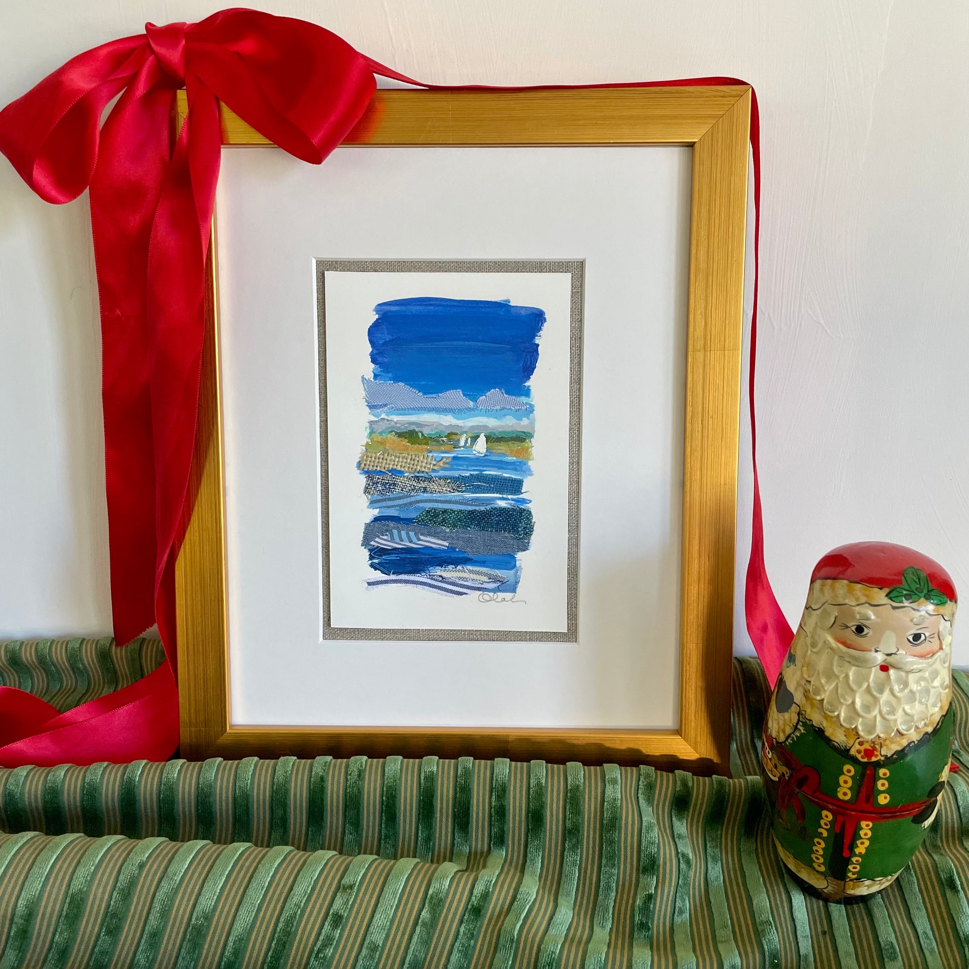 Gold wood frame included, archival white mat, mounted on natural linen, acrylic plexi cover